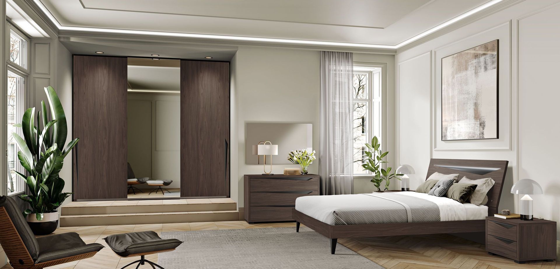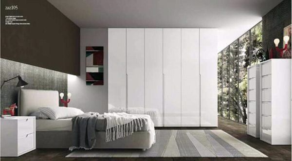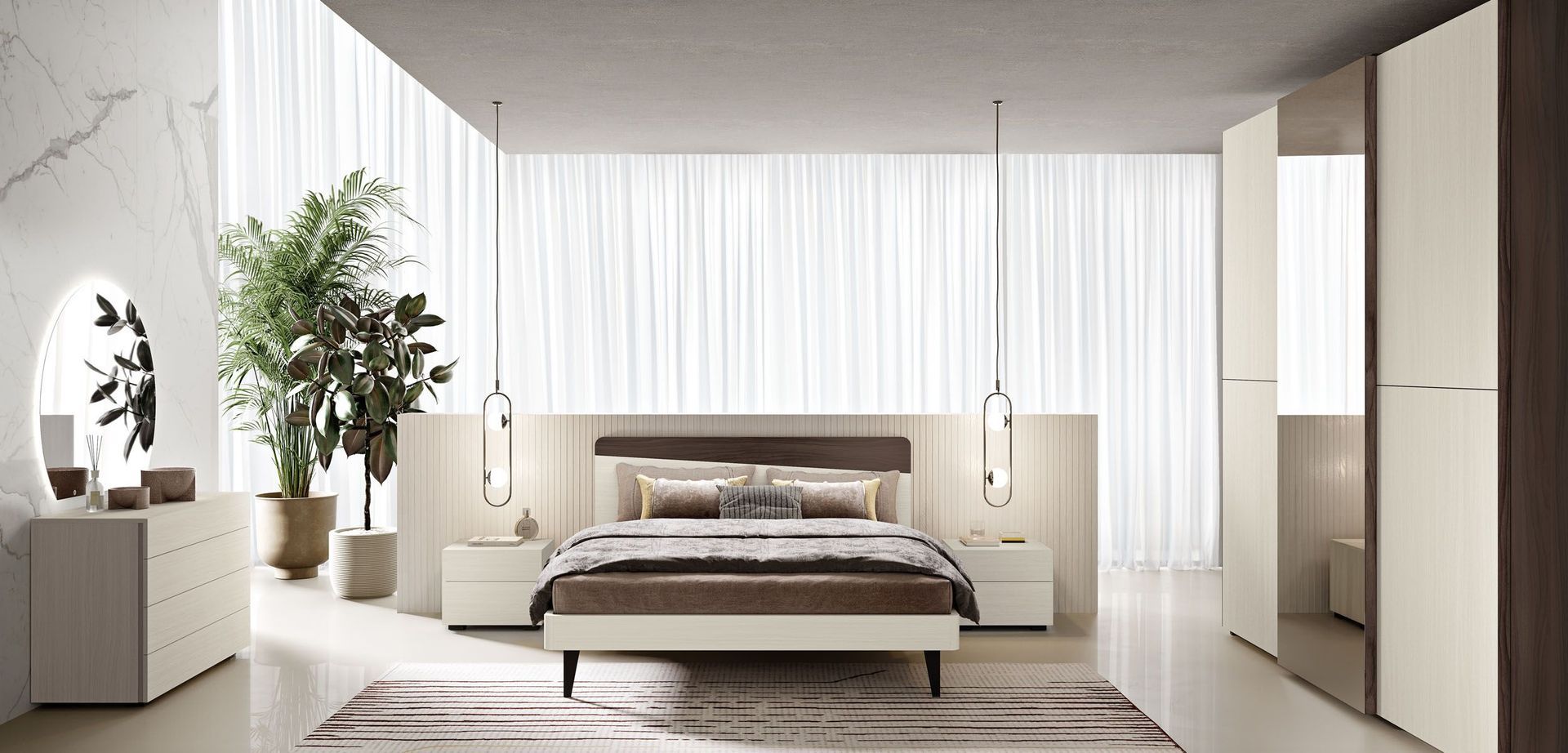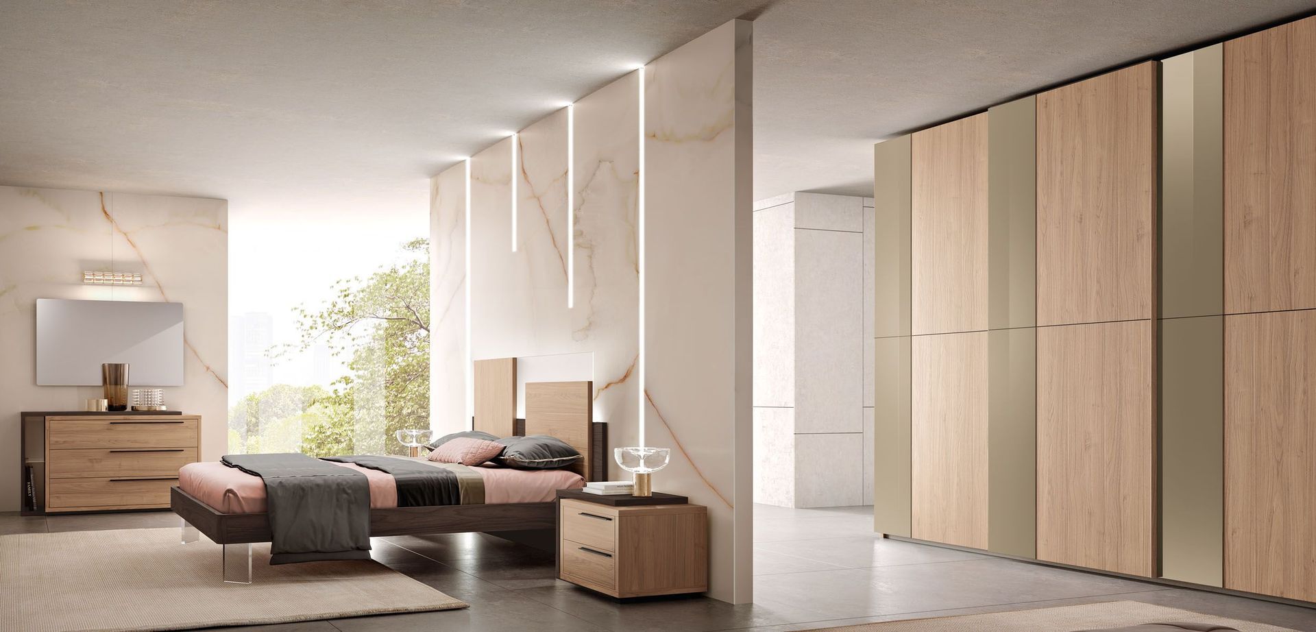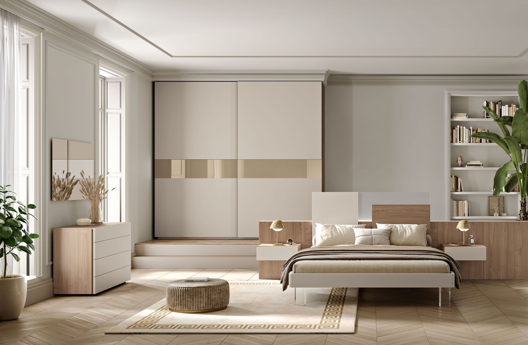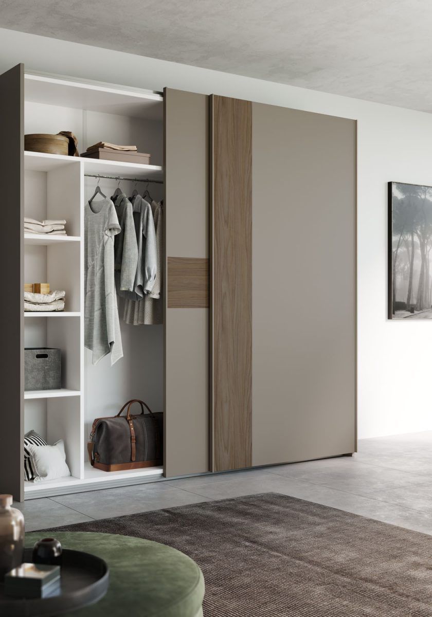 Armadio scorrevole Plus in tinta Visone con inserti su ante in finitura Noce e maniglioni in tinta Visone.