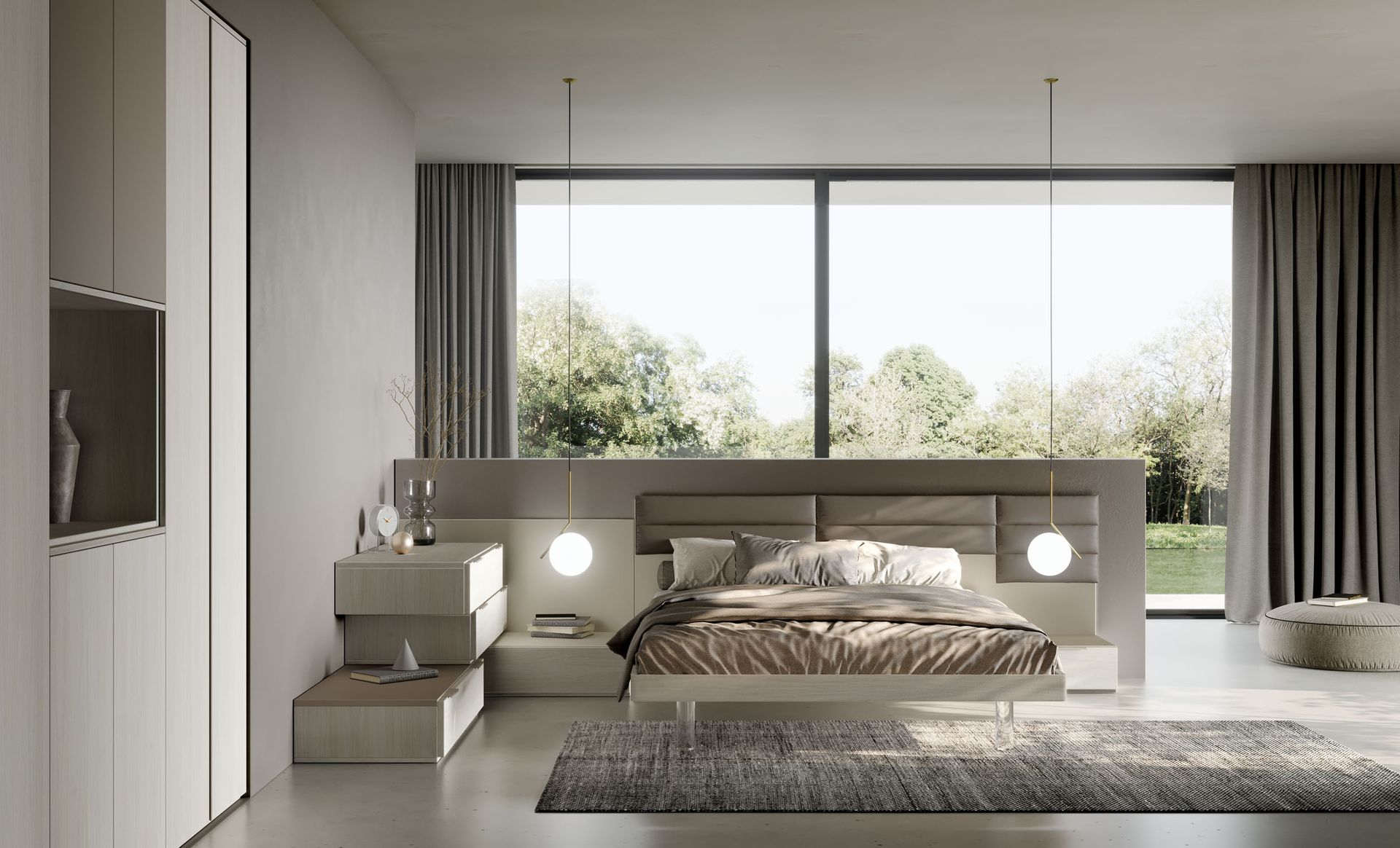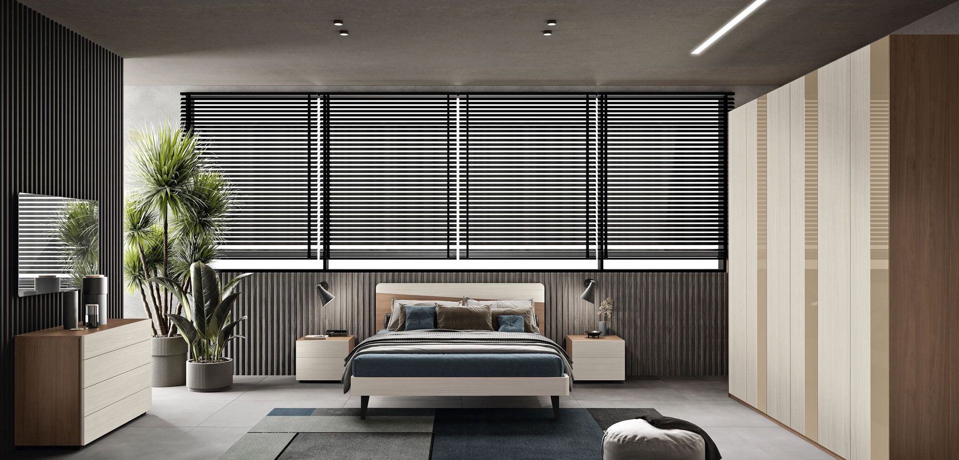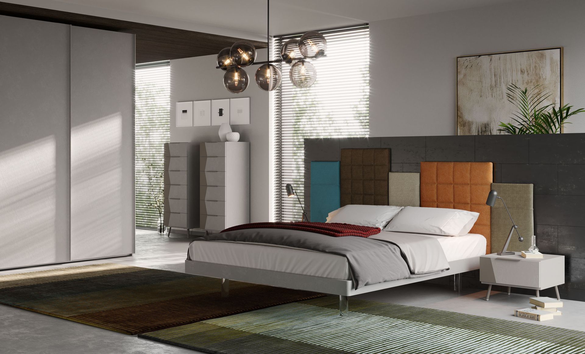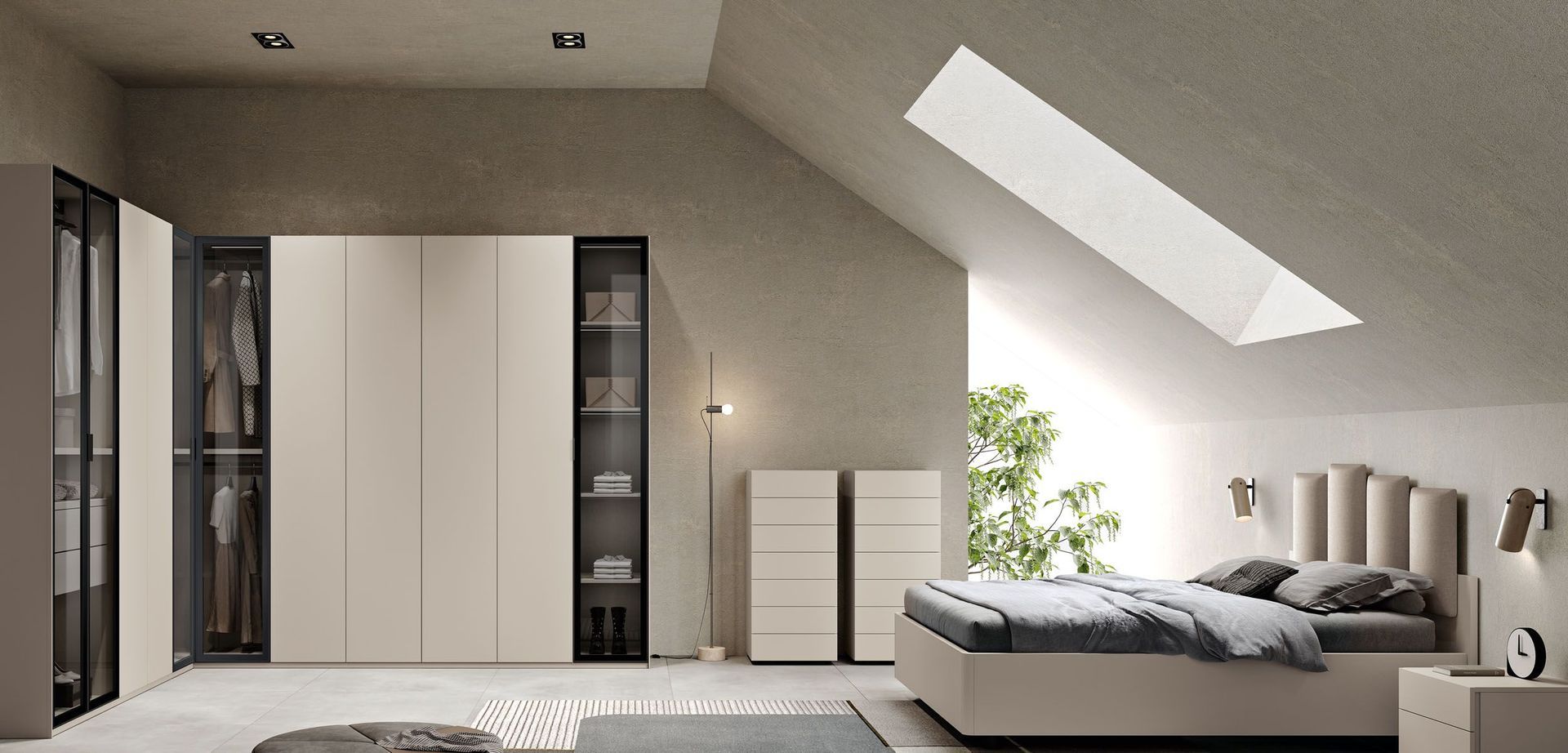 Armadio Plus e maniglioni in finitura Grigio spatolato.