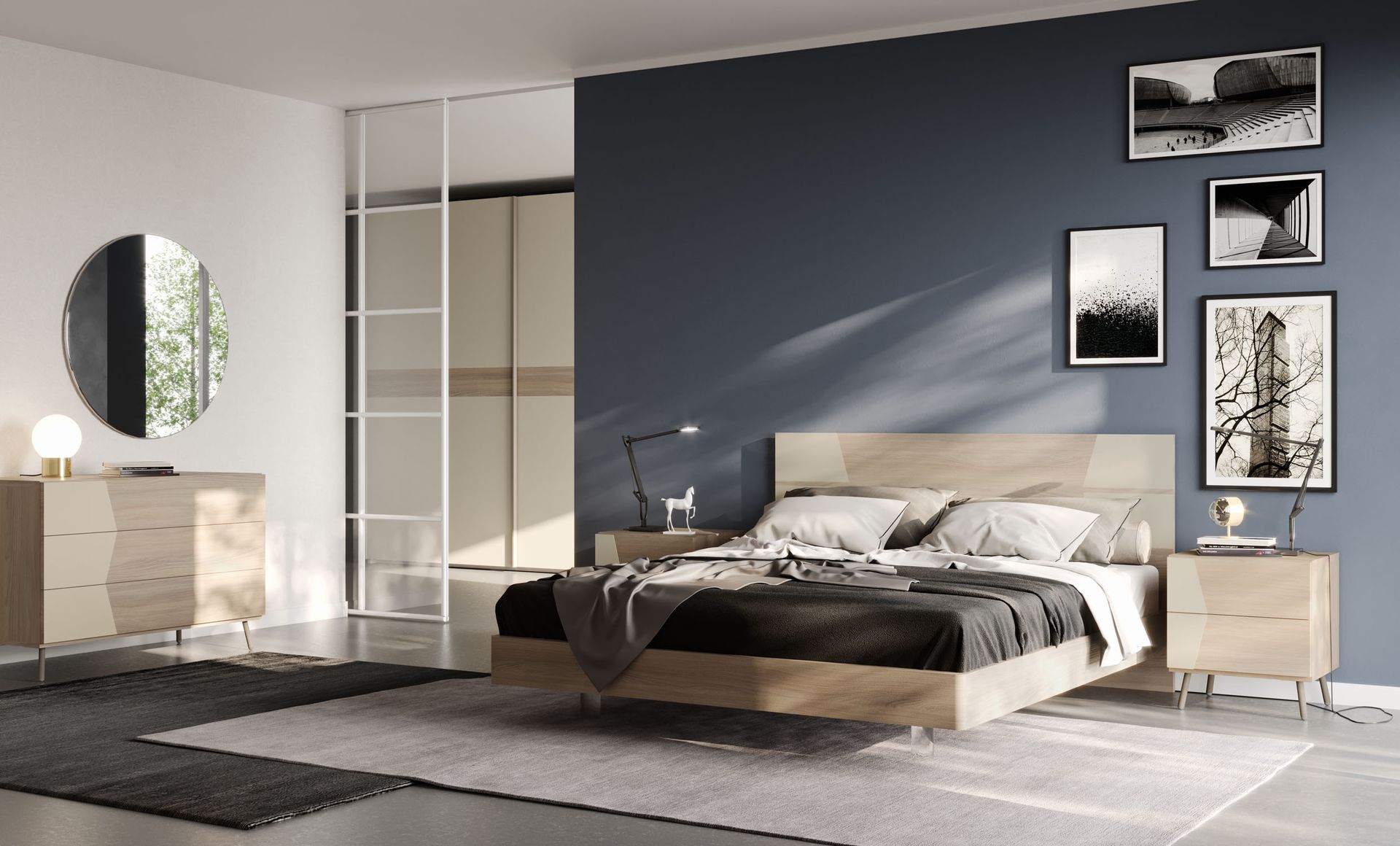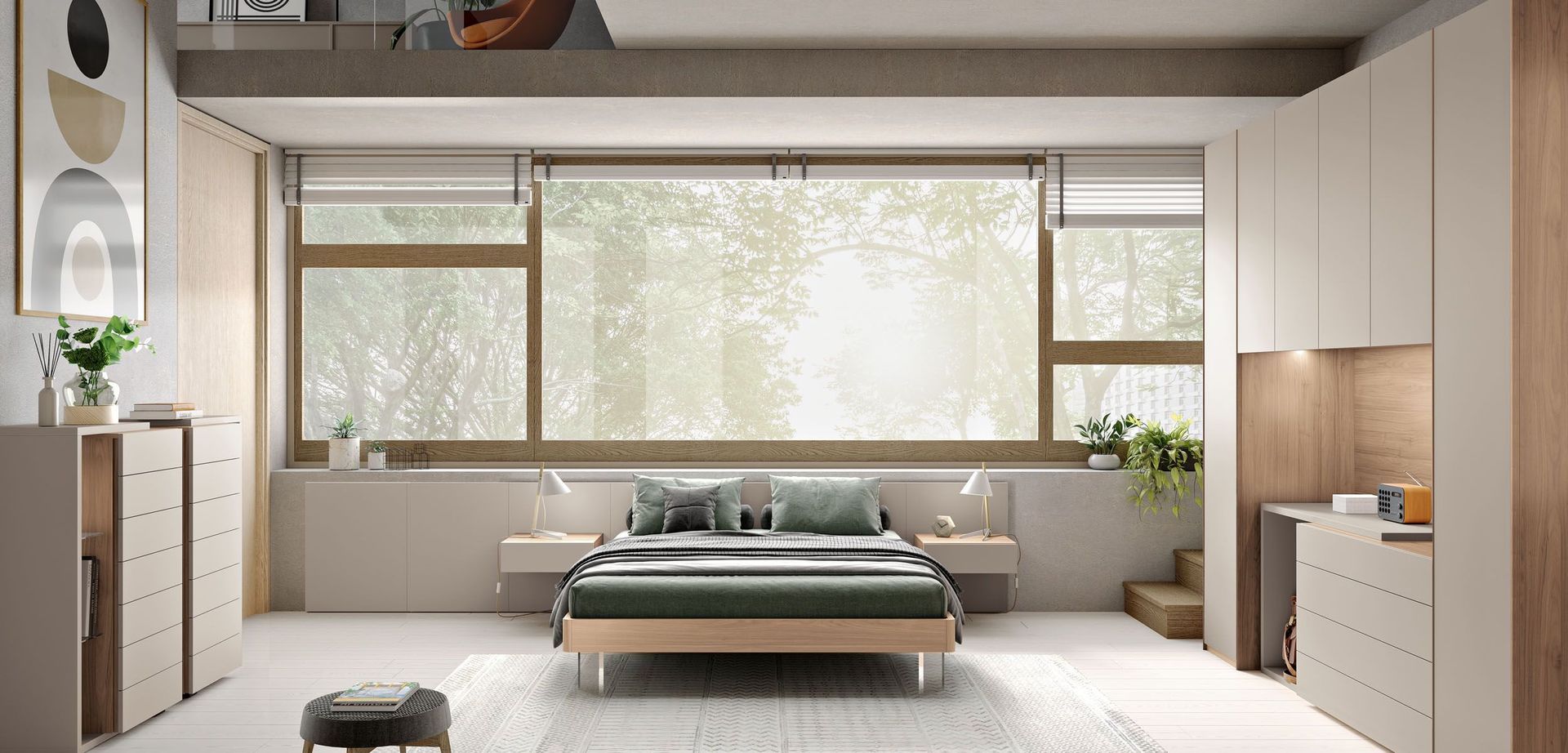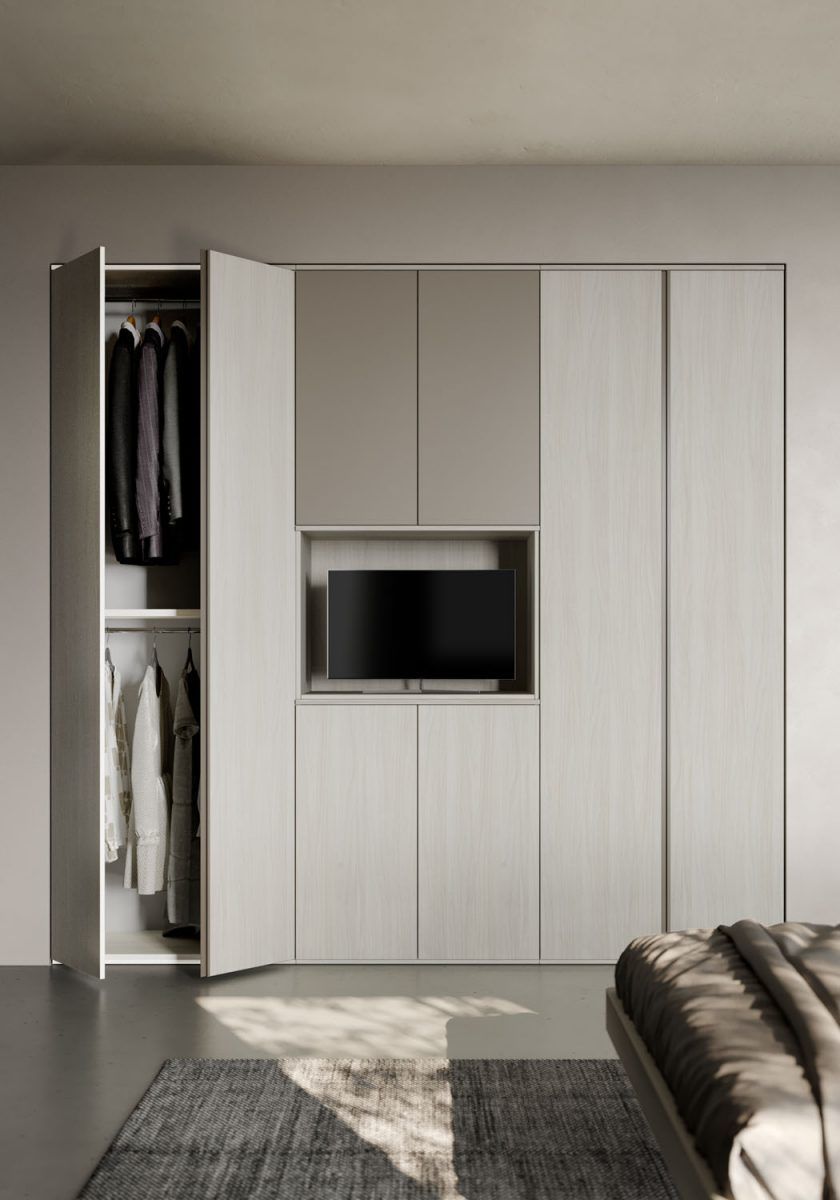 Armadio in finitura Natural wood con ante centrali superiori in tinta Visone. Moduli laterali con maniglia gola in tinta Visone e modulo centrale con ante push-pull.