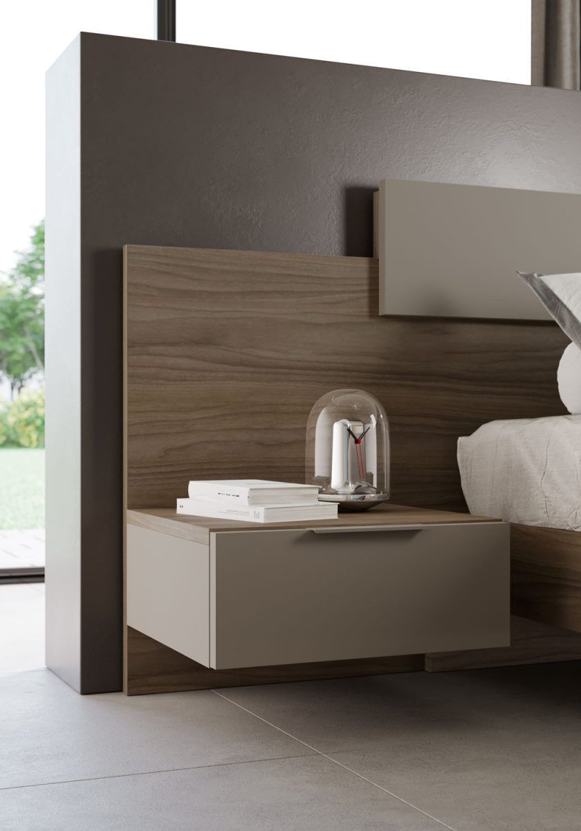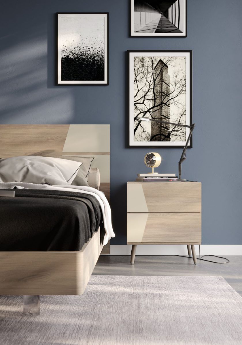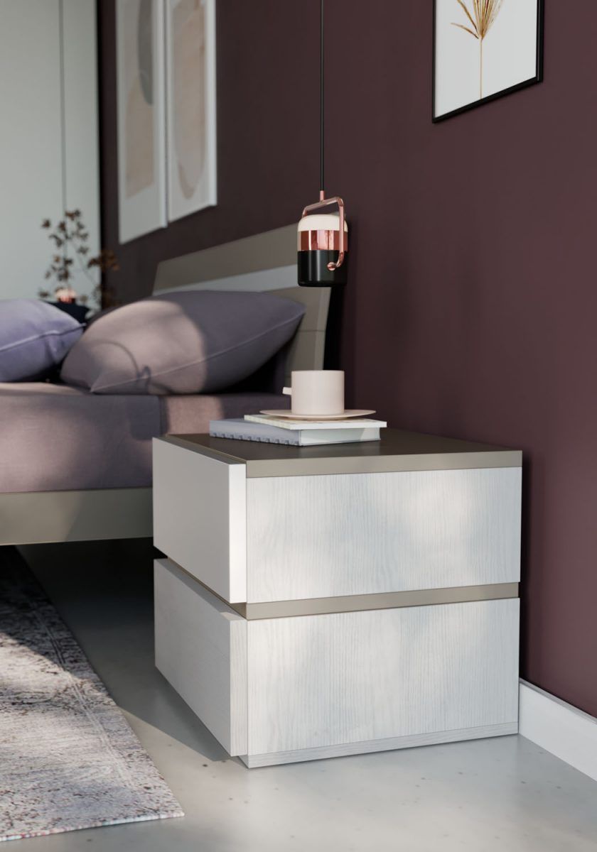Comodino in finitura Olmo con cassetti push-pull e applicativi in tinta Sabbia; piedini Free in tinta Visone.