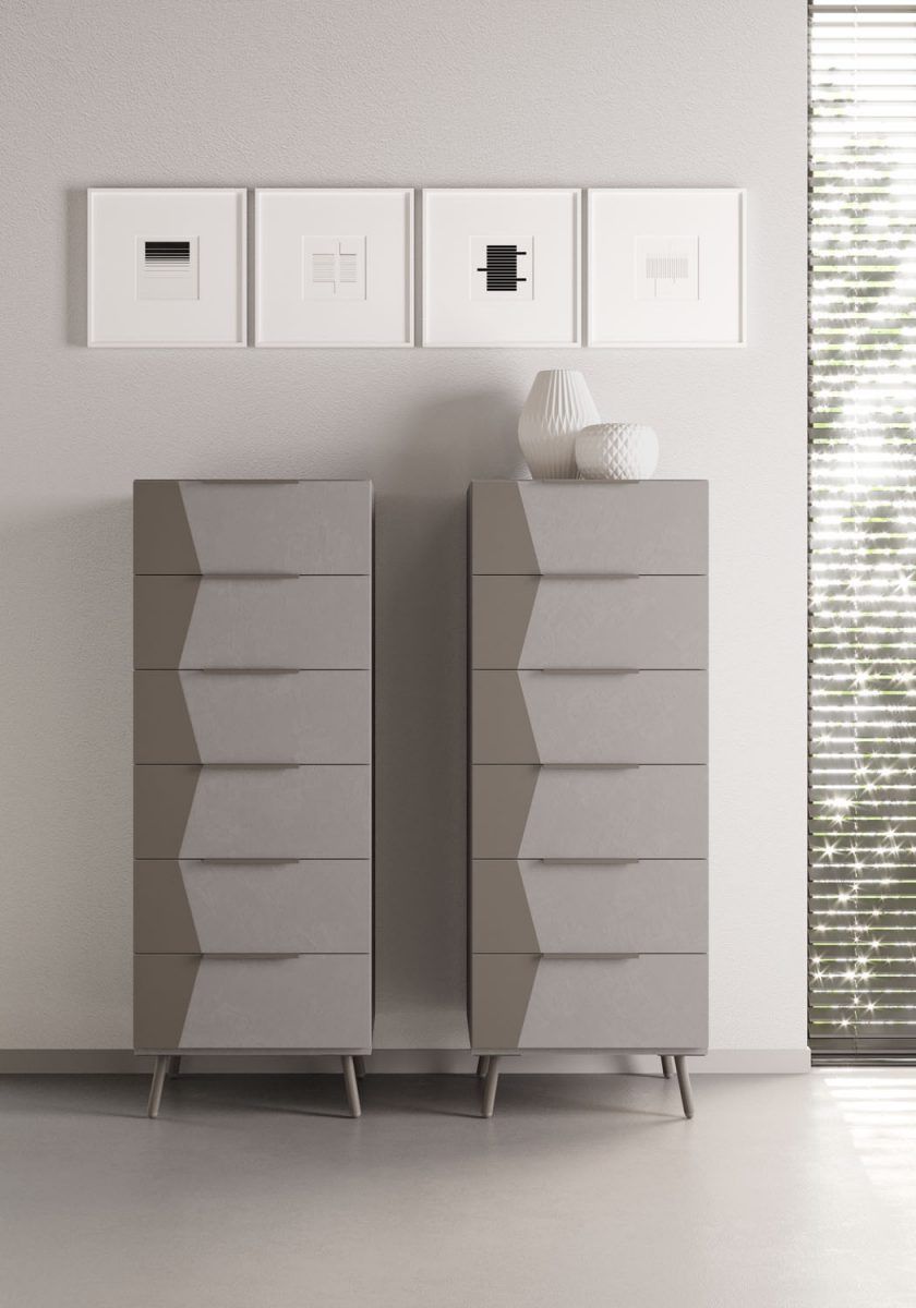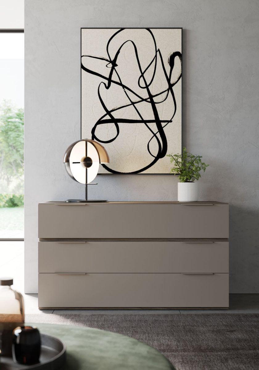Comò Linear in tinta Visone con dettagli in finitura Noce e maniglie Zed in tinta Visone.