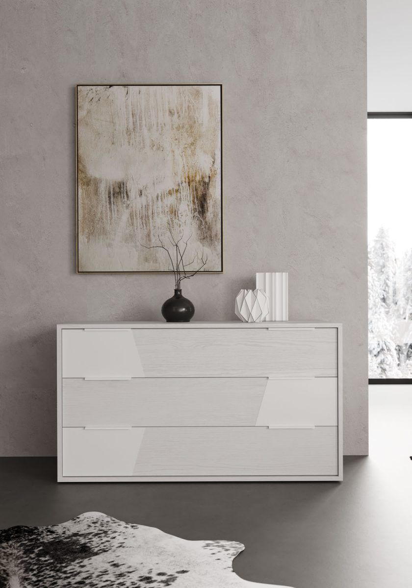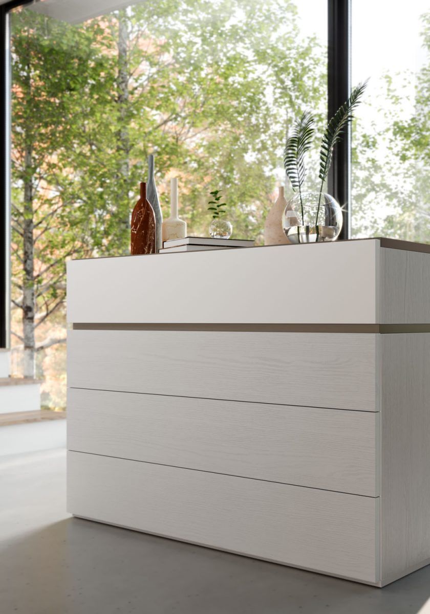 Comò Linear in finitura Frassino sbiancato con cassetti push-pull; cassetto superiore in tinta Bianco, dettagli e top in tinta Visone.