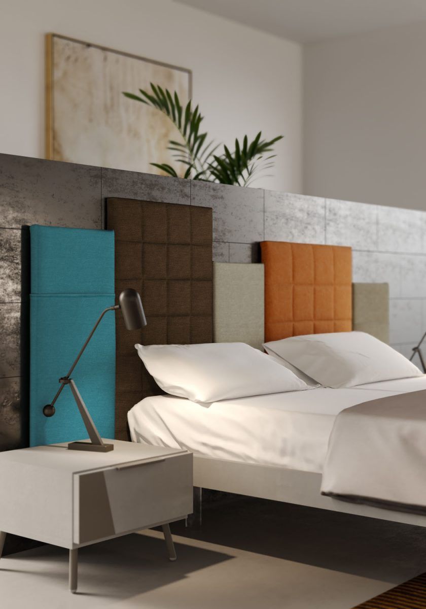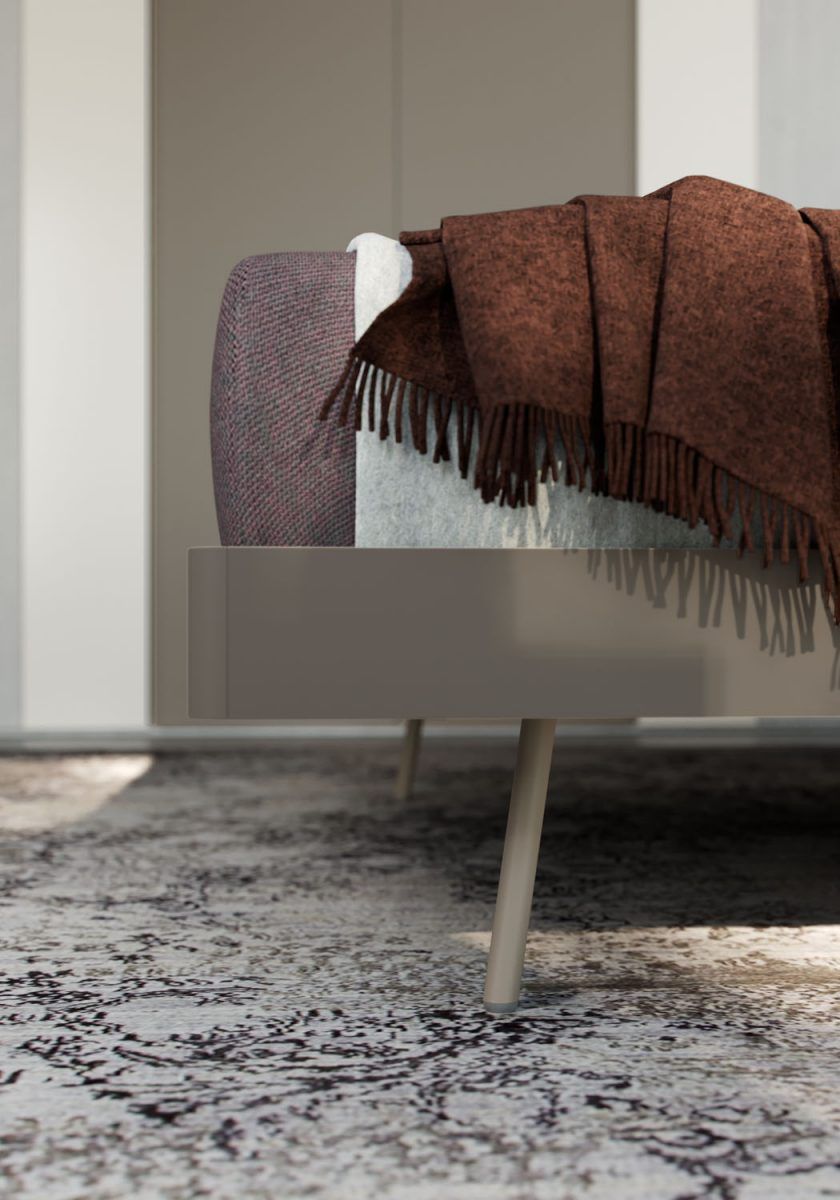 Giroletto Evoluzione in finitura Grigio spatolato con testiera App in tessuto Orinoco e Sun imbottita, piedini Cilindro in plexiglass trasparenti.