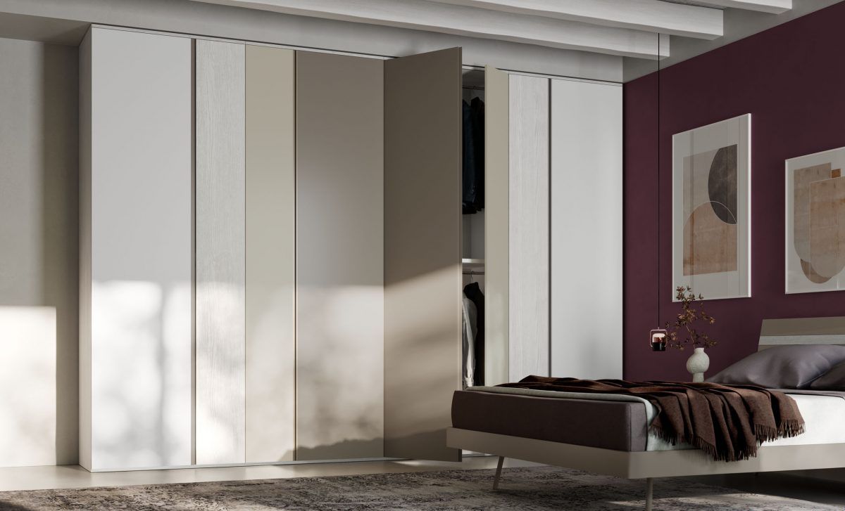Armadio con gola battente in finitura Frassino sbiancato, ante in finitura Frassino sbiancato e in tinta Bianco, Sabbia e Visone. Maniglia gola in tinta Visone su ante da 60.