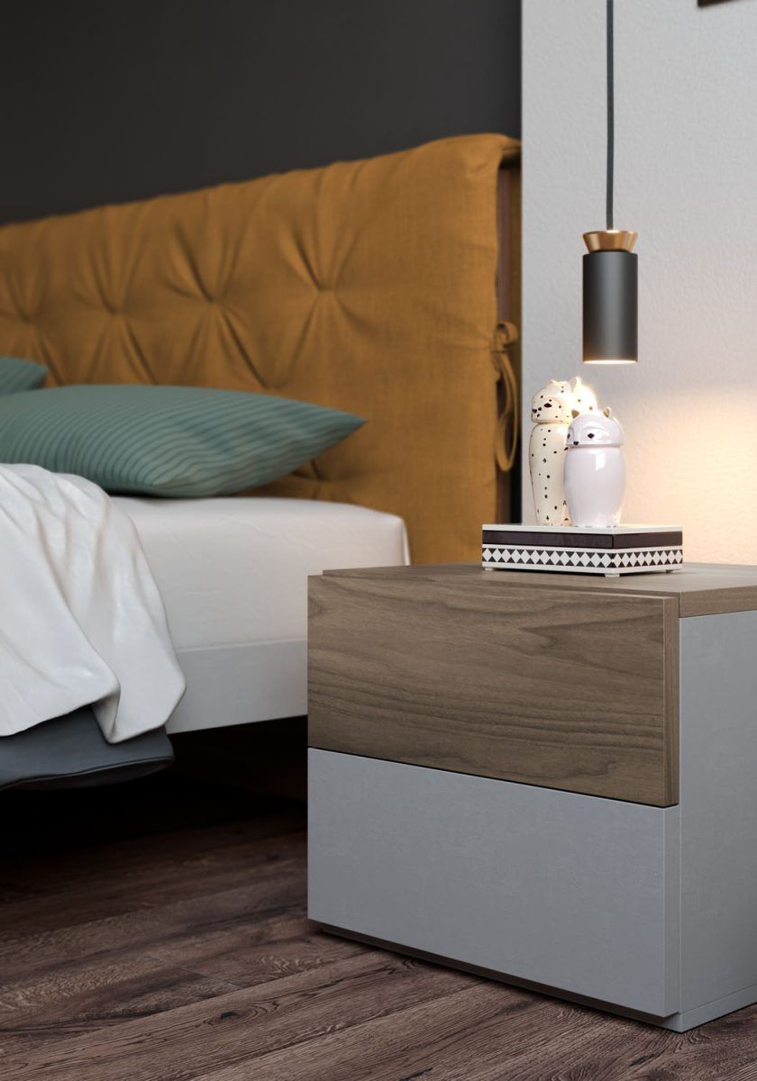 Comodino Simple in finitura Grigio spatolato con cassetti push-pull; cassetto superiore e top in finitura Noce.
