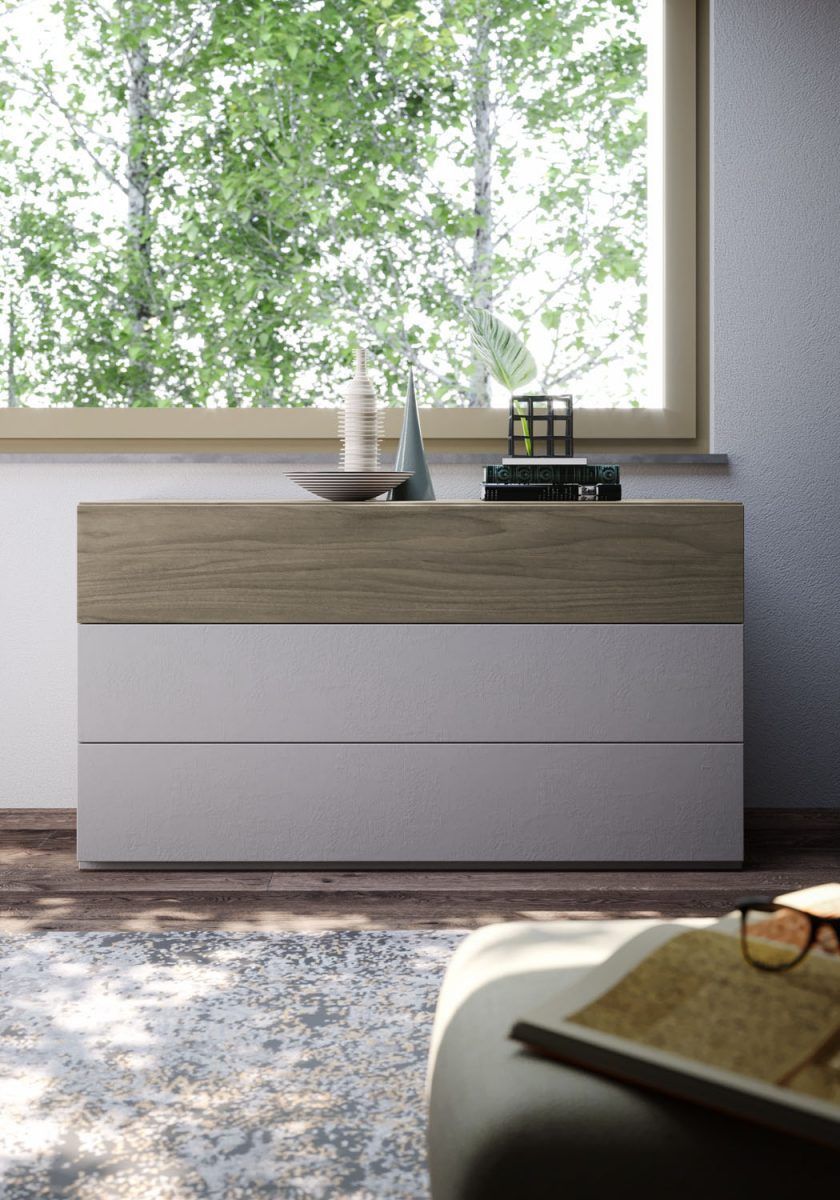 Comò Simple in finitura Grigio spatolato con cassetti push-pull; cassetto superiore e top in finitura Noce.