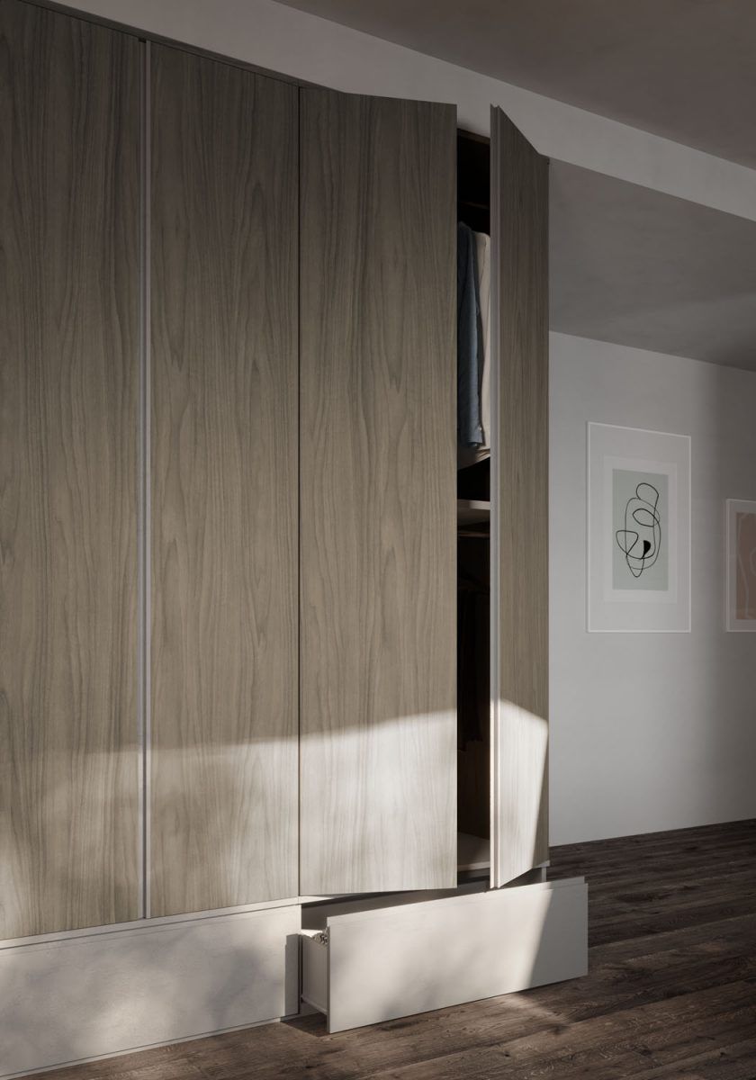 Armadio con ante in finitura Noce con cestoni alla base in finitura Grigio spatolato e maniglia gola in tinta Grigio.