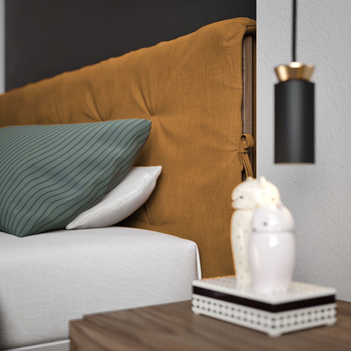 Giroletto Folding in finitura Olmo, testiera Shape in finitura Olmo con applicativi in tinta Sabbia e piedini Cilindro in plexiglass trasparenti.