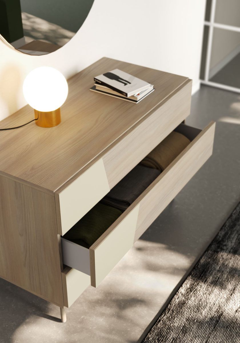 Comò in finitura Olmo con cassetti push-pull e applicativi in tinta Sabbia; piedini Free in tinta Visone.