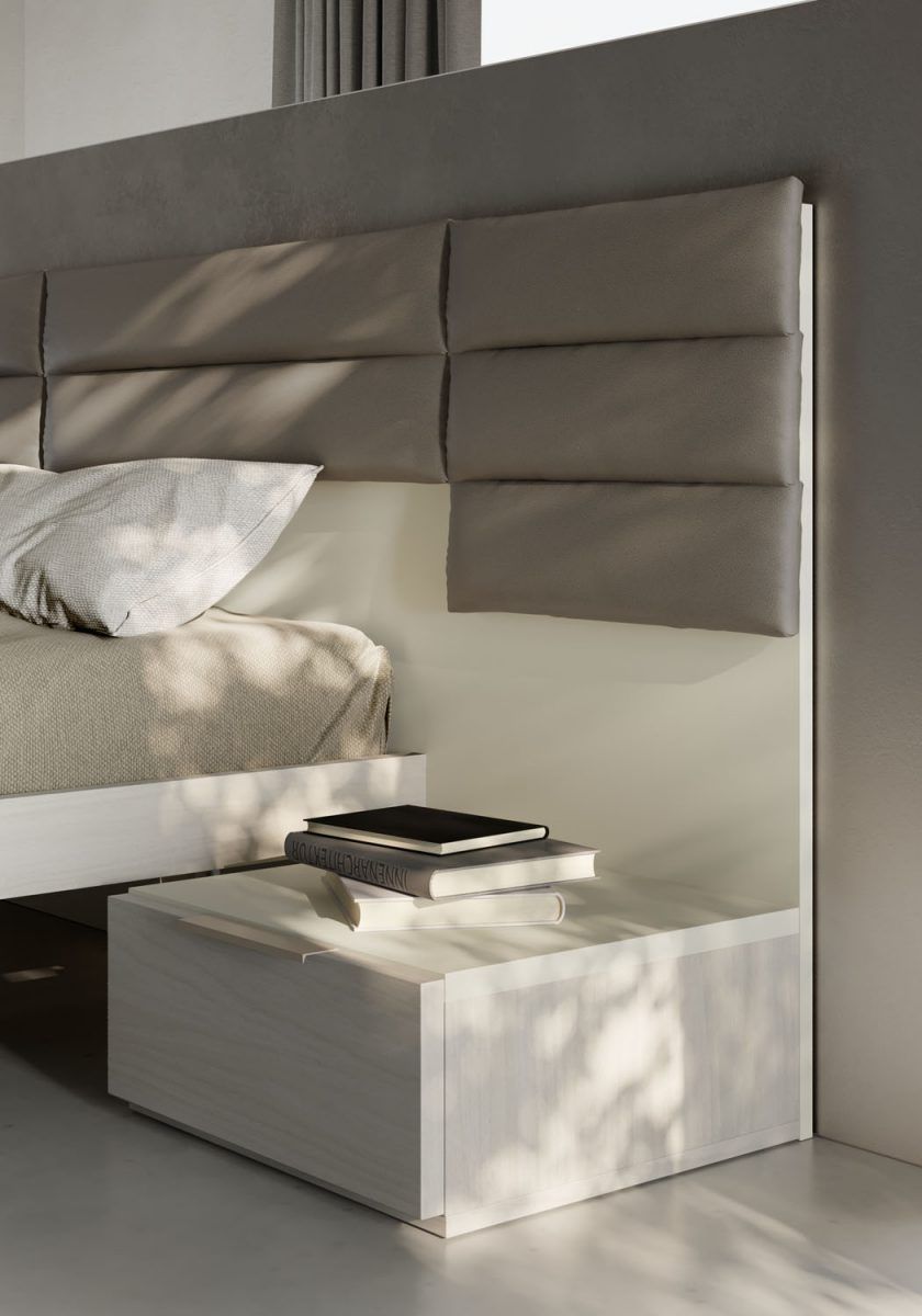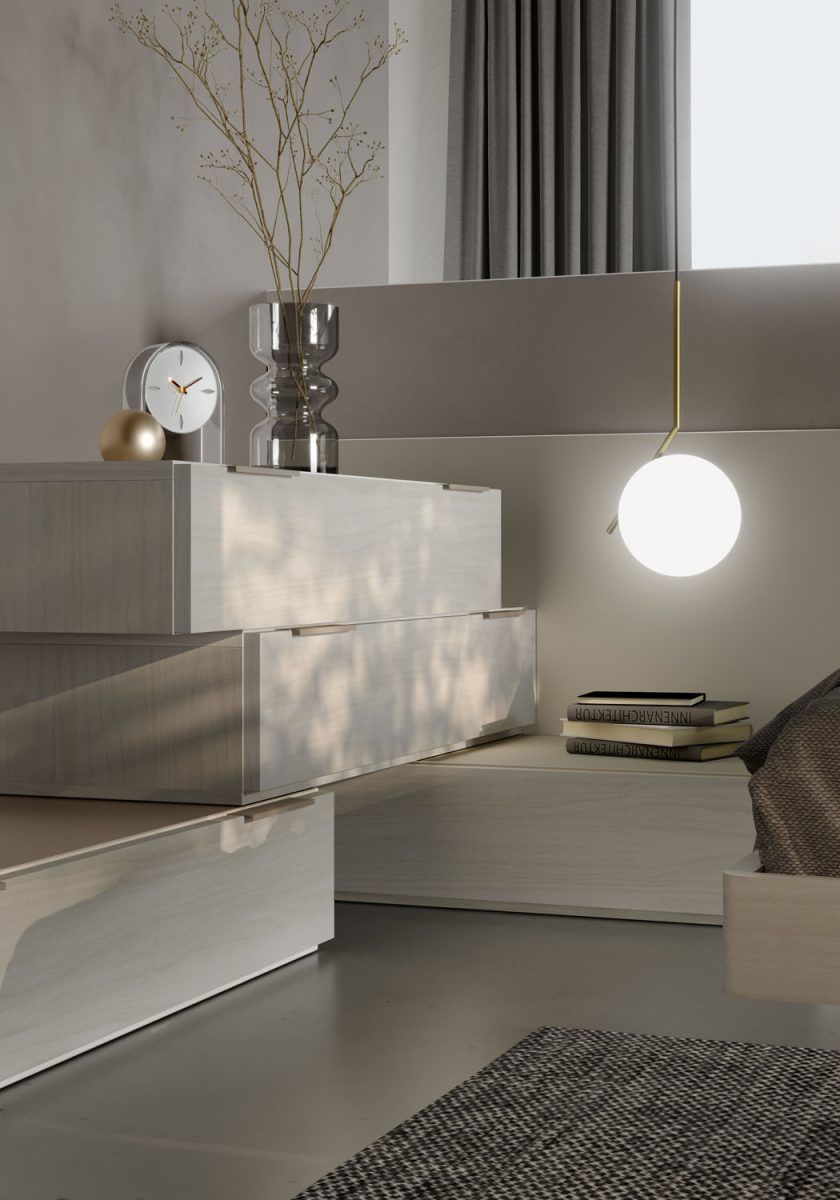 Comodino Linear in finitura Frassino sbiancato con cassetti push-pull; cassetto superiore in tinta Bianco, dettagli e top in tinta Visone.