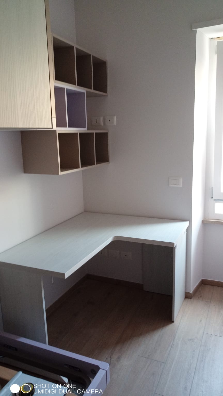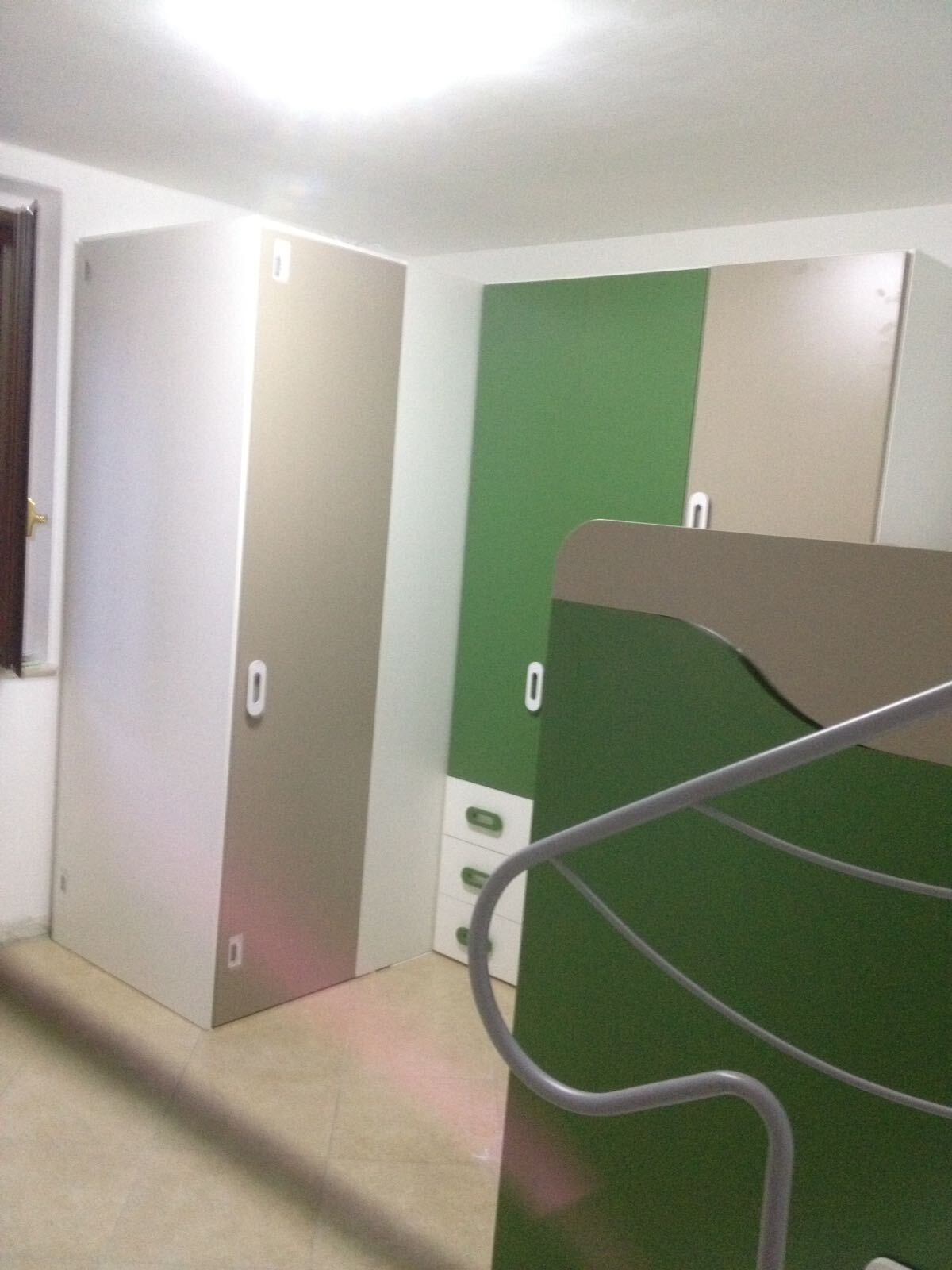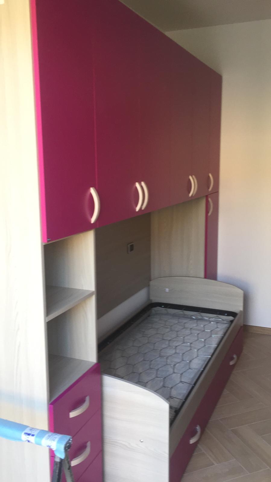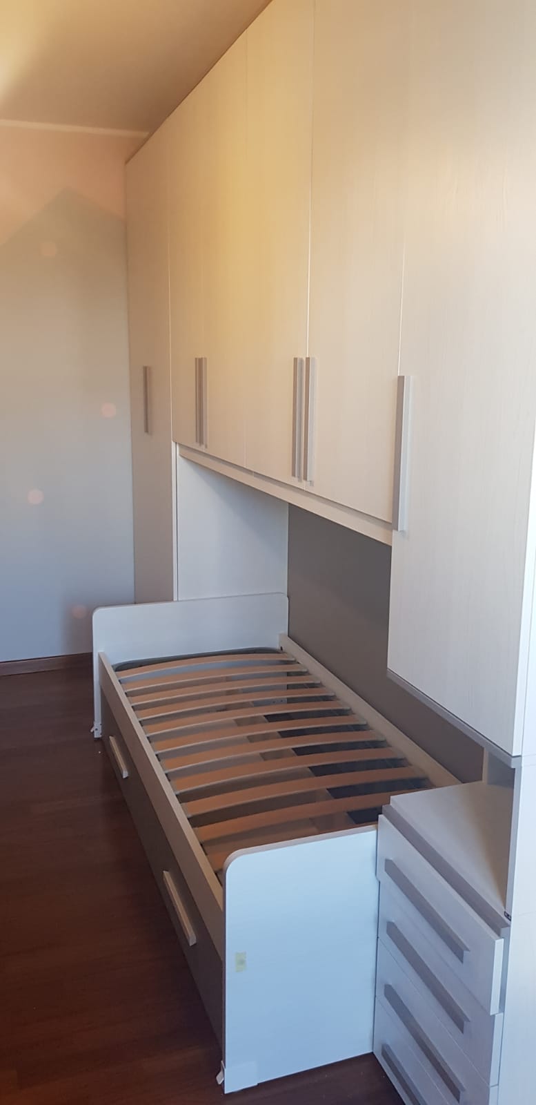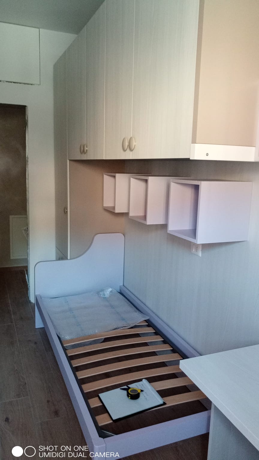 La composizione si completa con un piano scrivania, mensole e pensili ad anta vasistas, armadio alto a 4 cassetti posti sulla parete frontale ai letti.