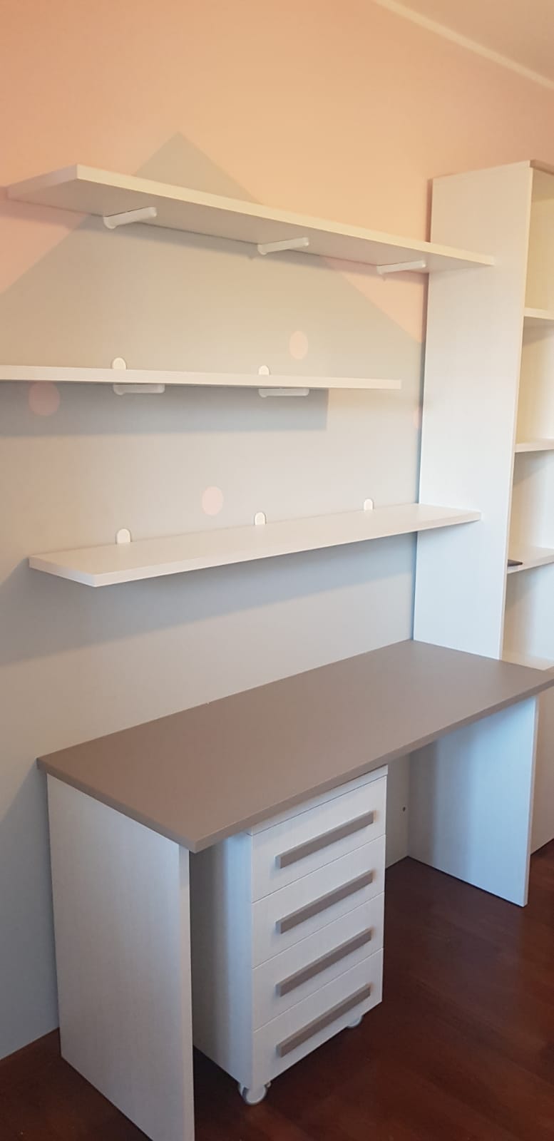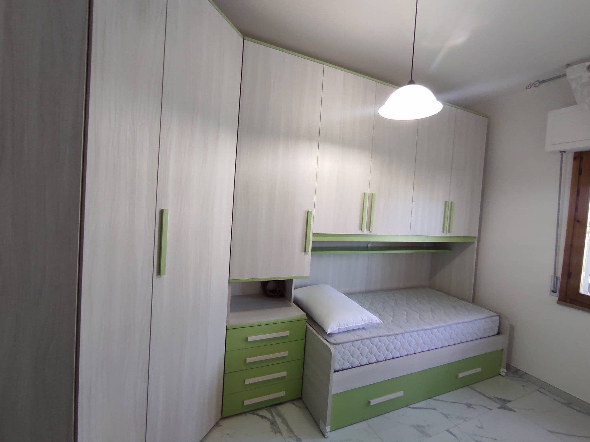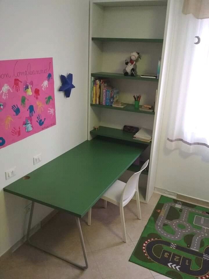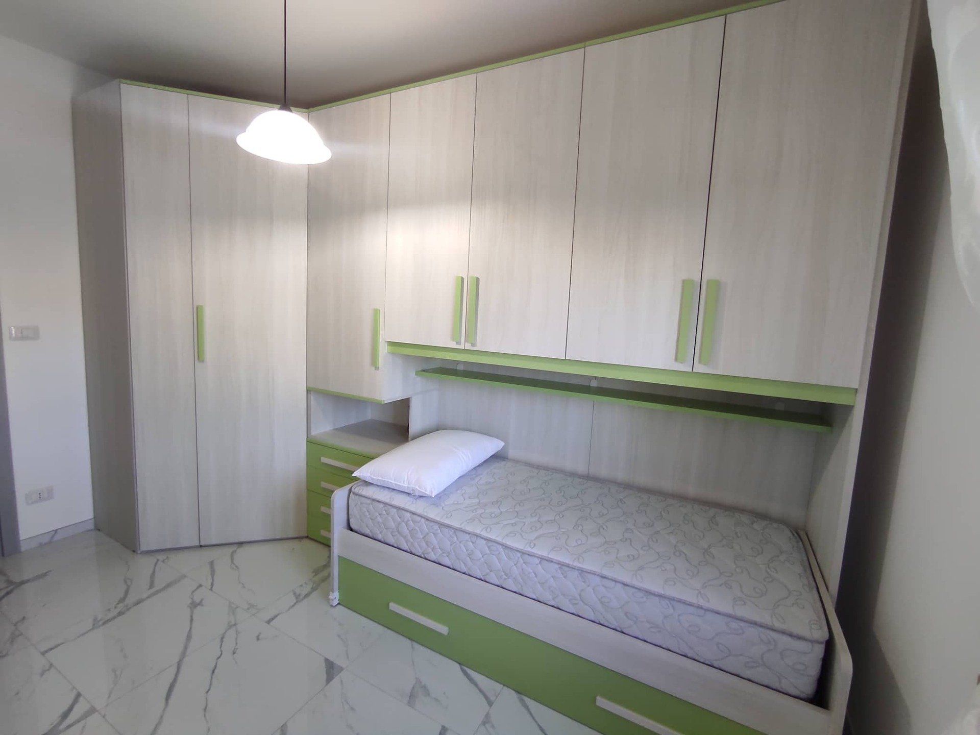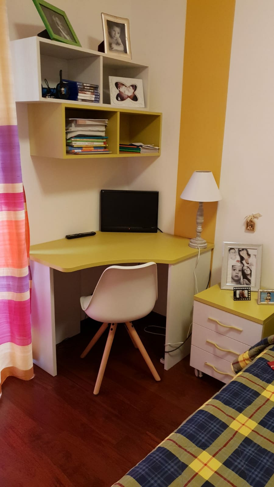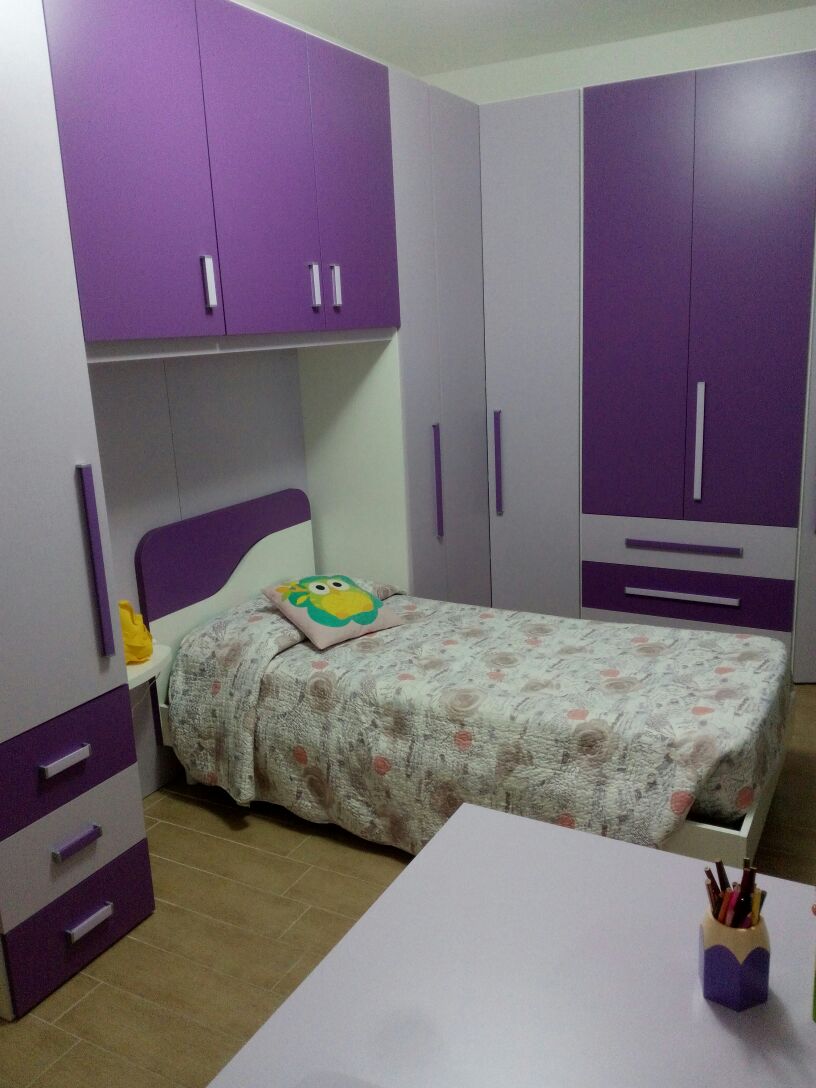 La composizione si completa con un piano scrivania, mensole e pensili ad anta vasistas, armadio alto a 4 cassetti posti sulla parete frontale ai letti.