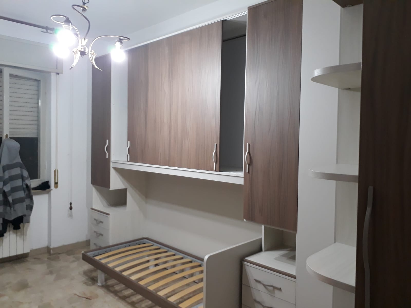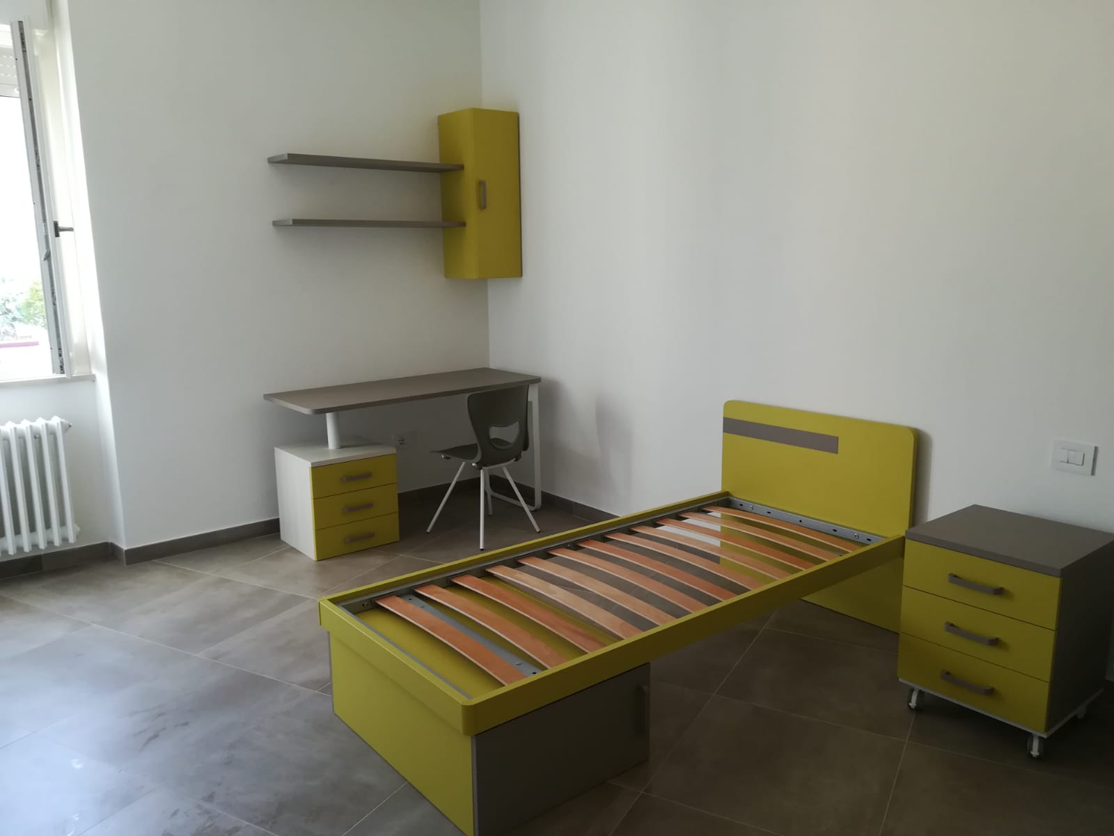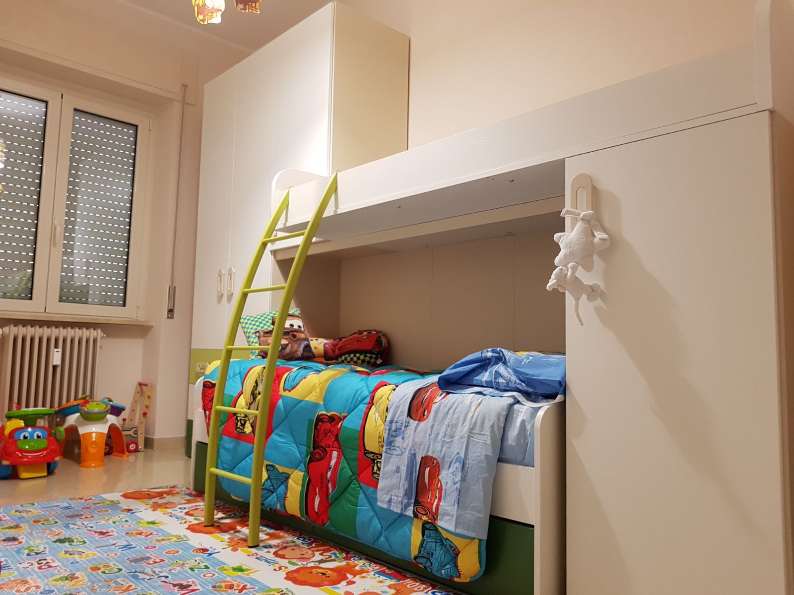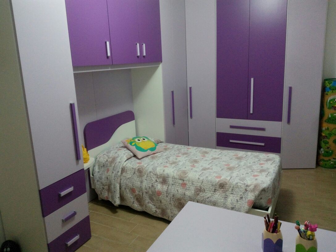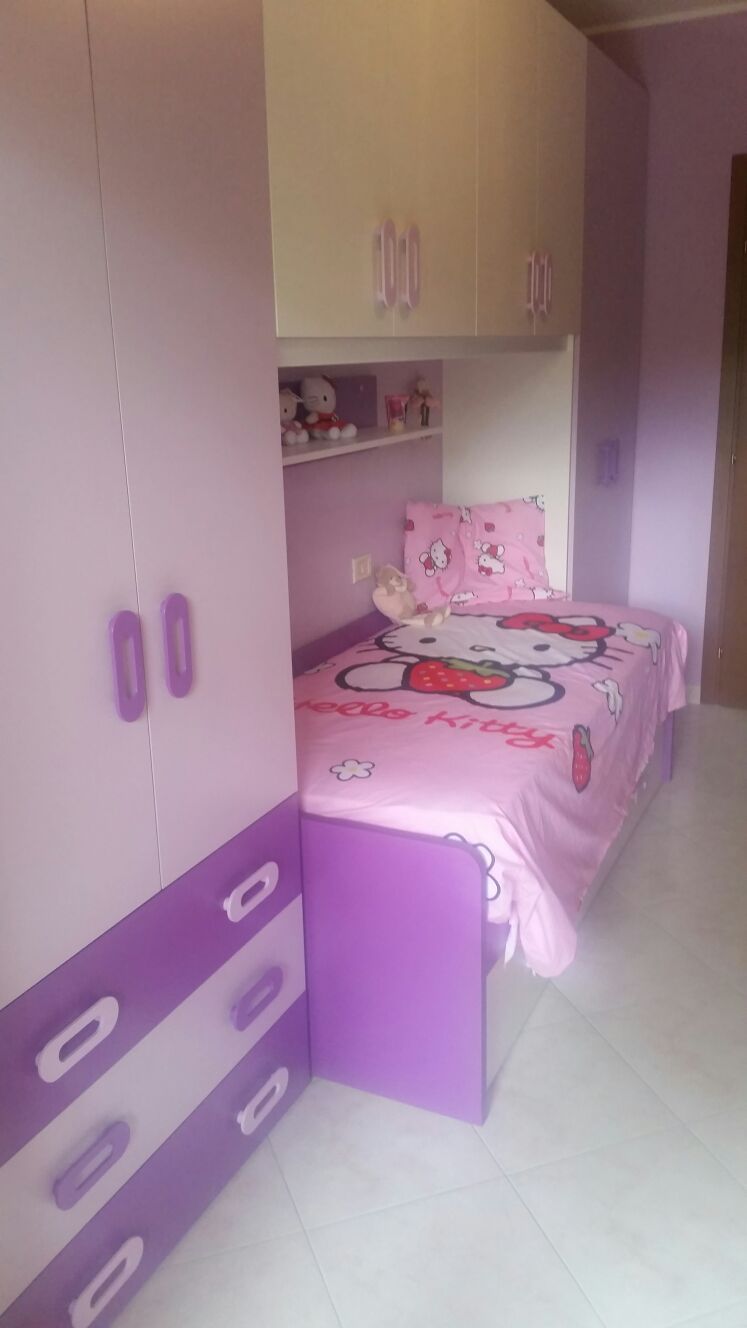 La composizione si completa con un piano scrivania, mensole e pensili ad anta vasistas, armadio alto a 4 cassetti posti sulla parete frontale ai letti.