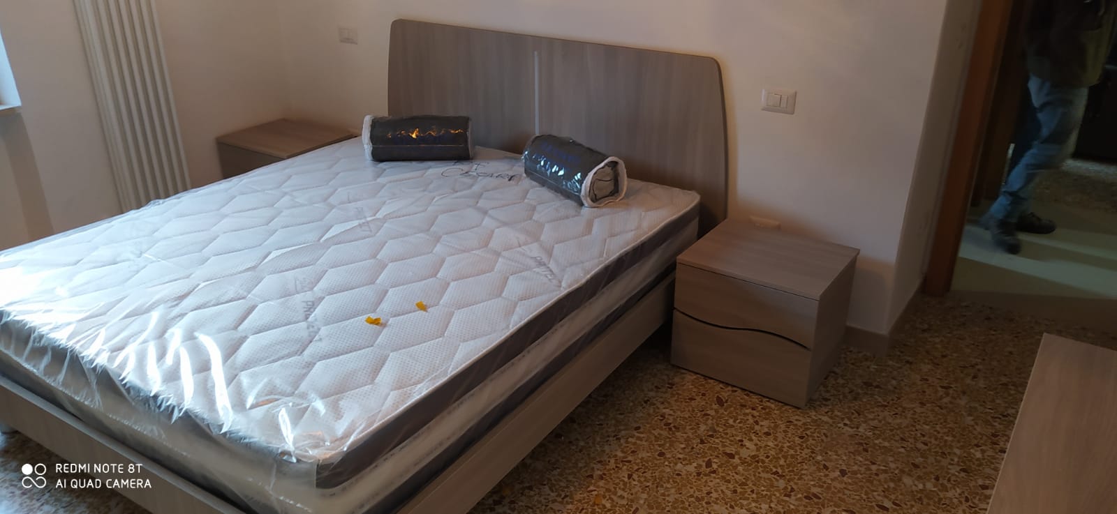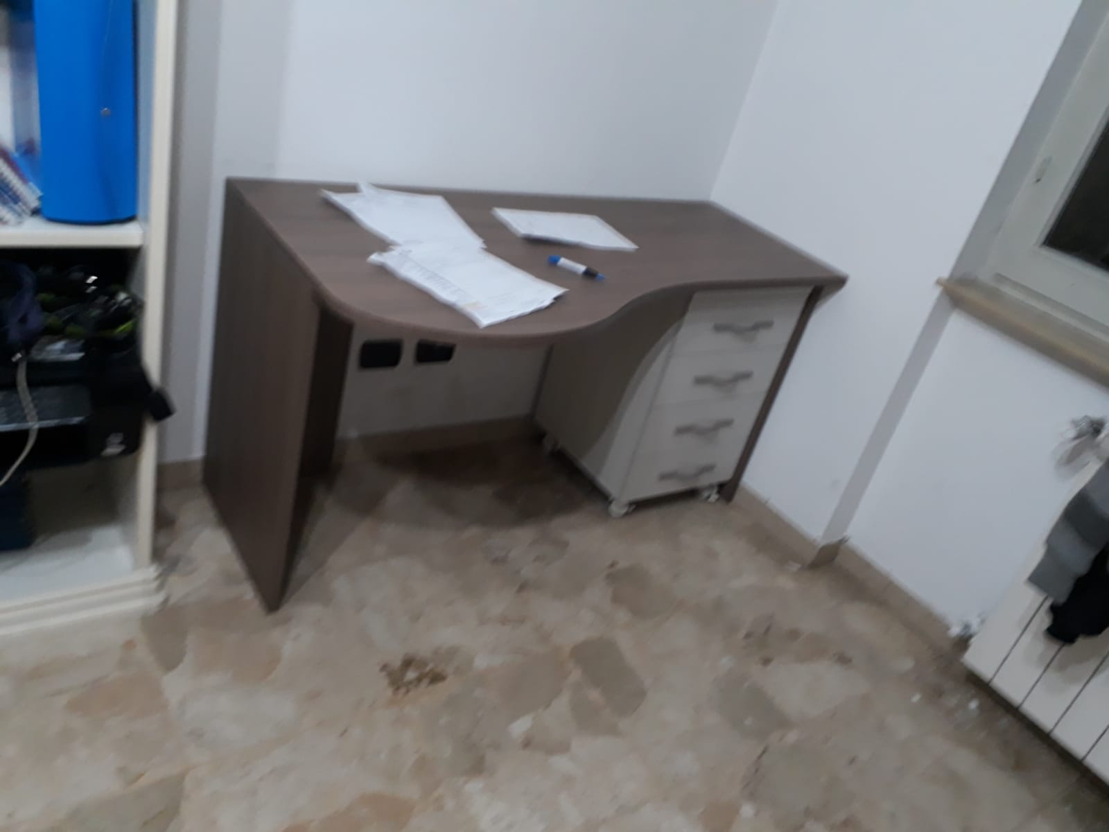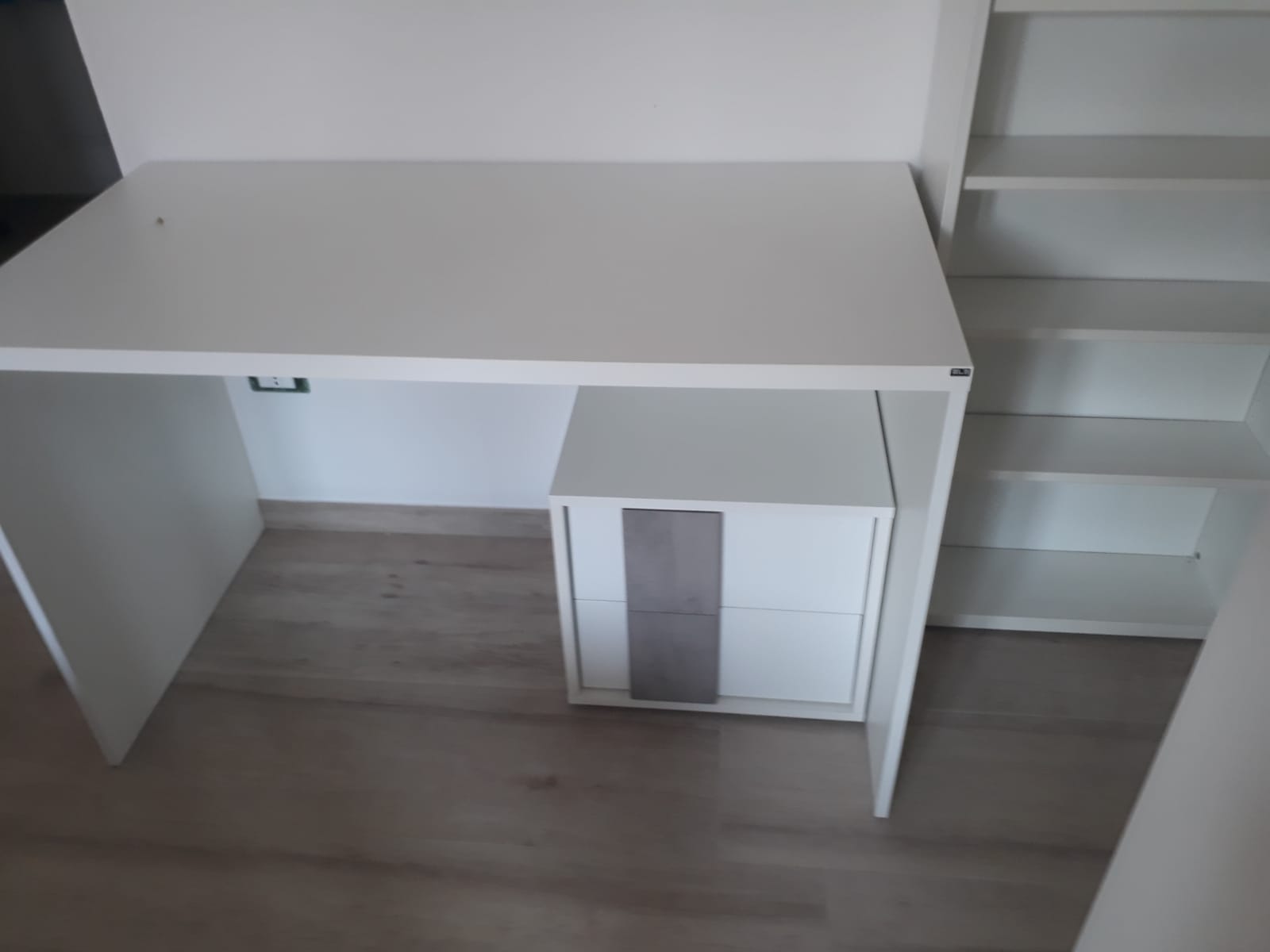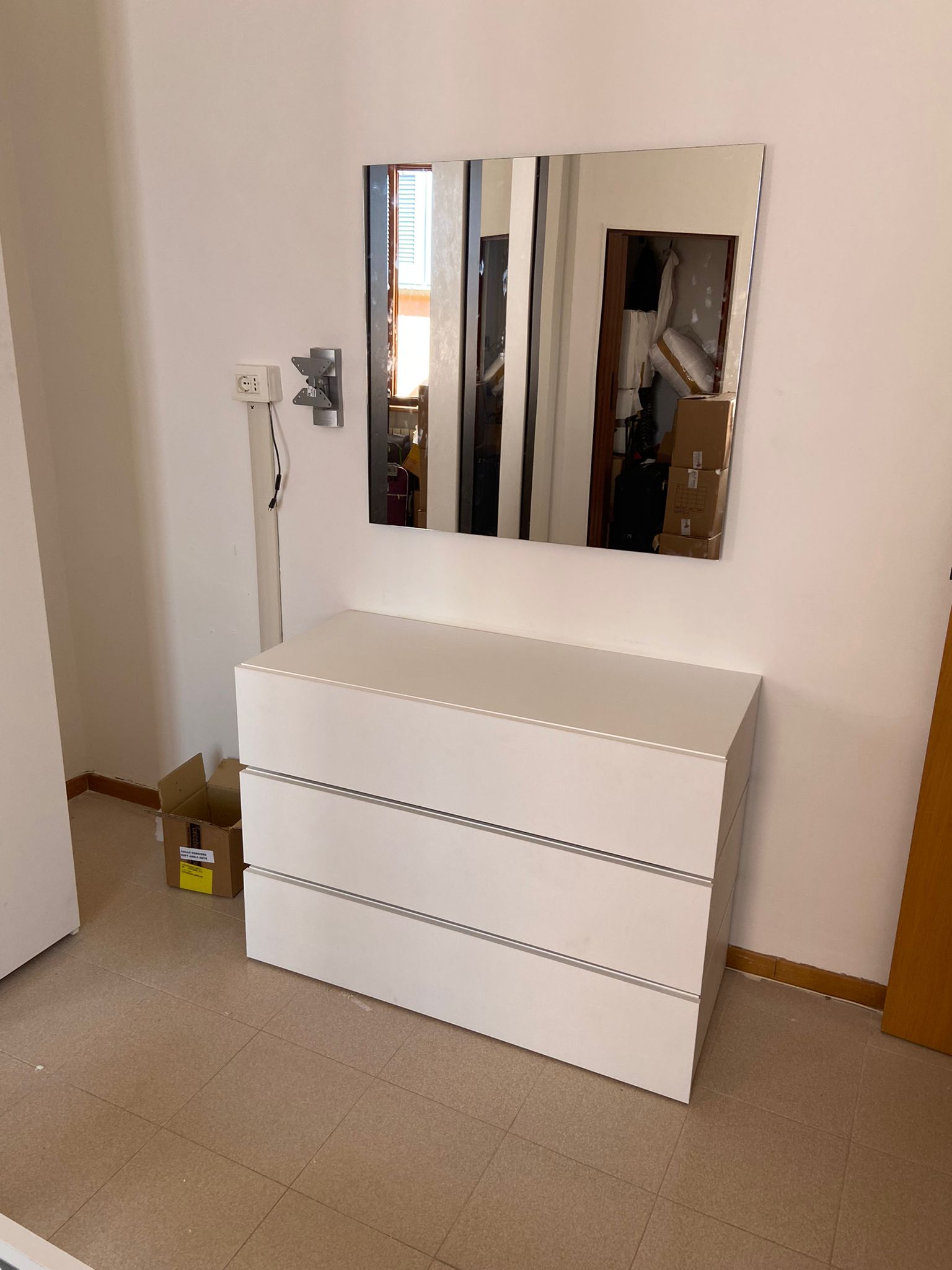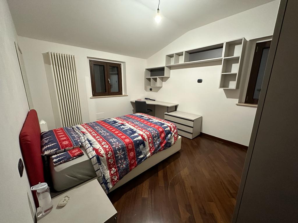 La composizione si completa con un piano scrivania, mensole e pensili ad anta vasistas, armadio alto a 4 cassetti posti sulla parete frontale ai letti.