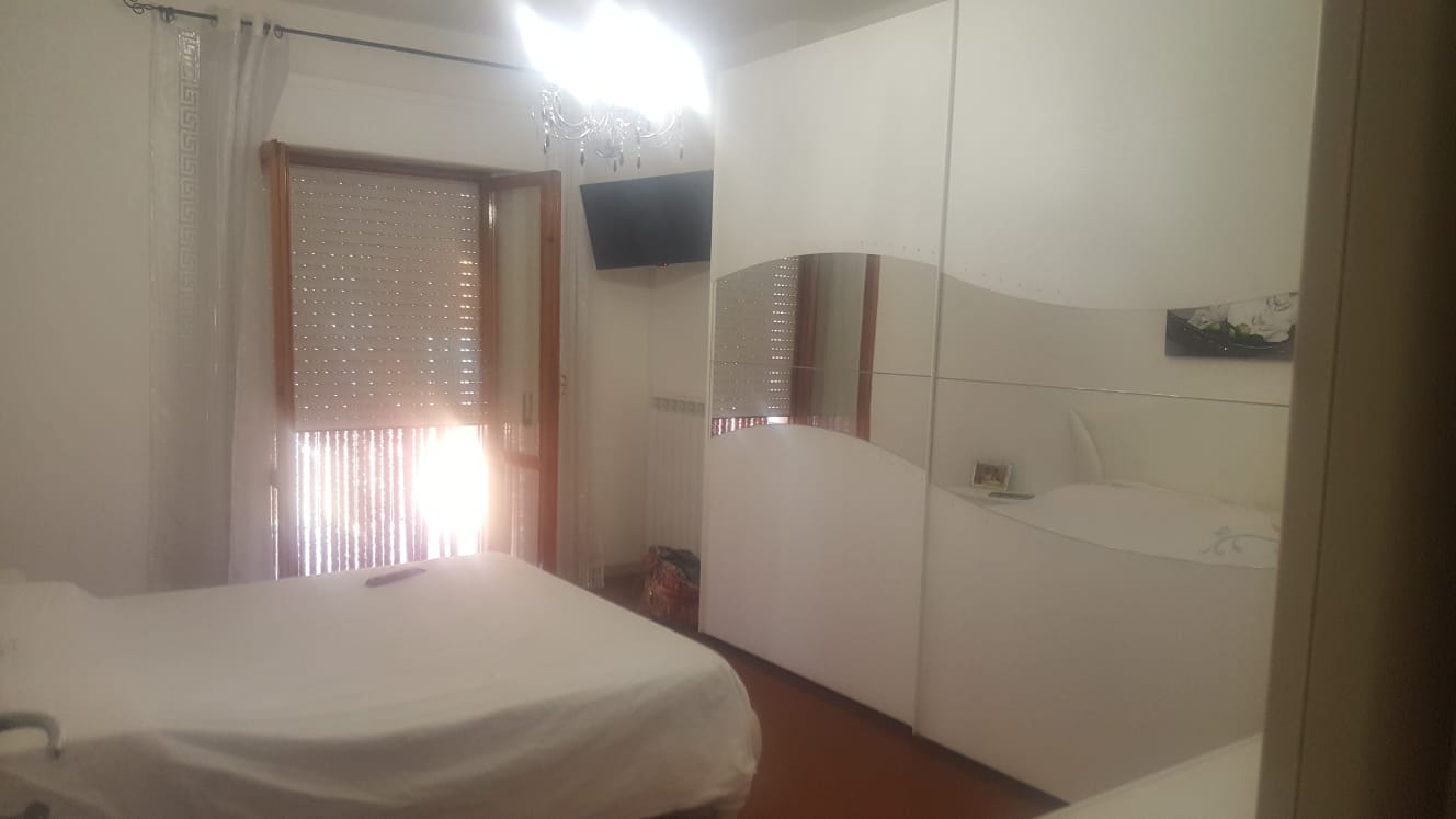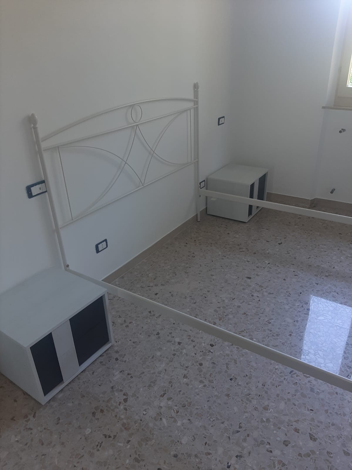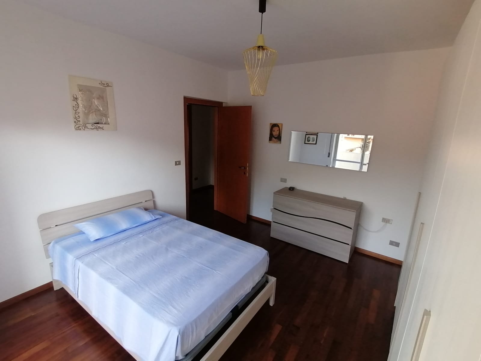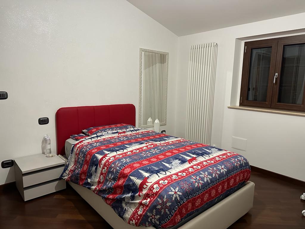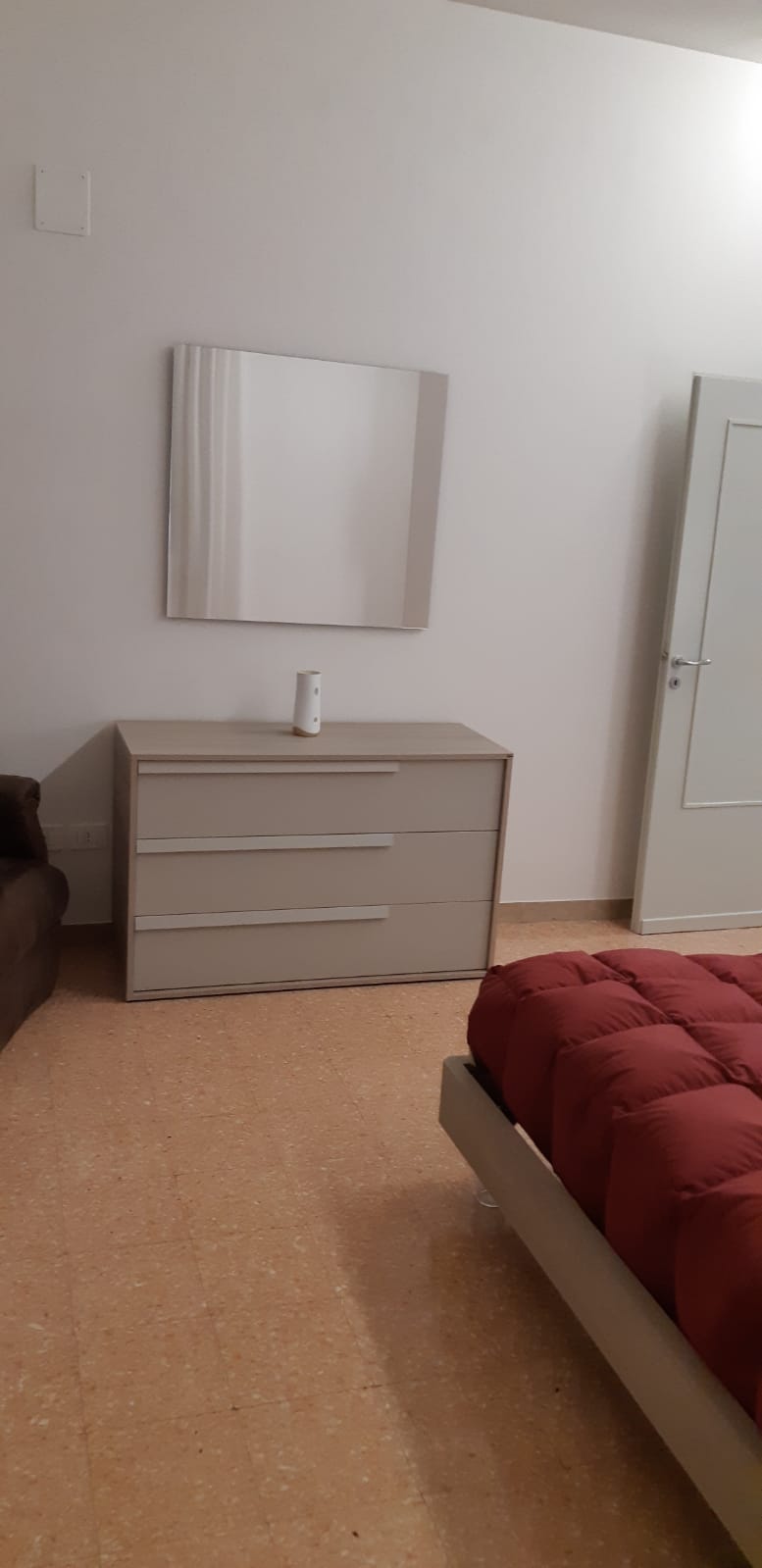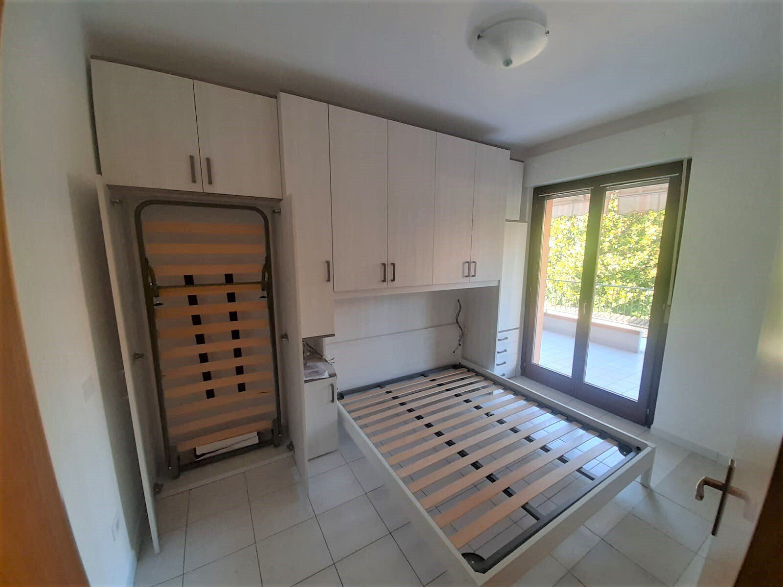 La composizione si completa con un piano scrivania, mensole e pensili ad anta vasistas, armadio alto a 4 cassetti posti sulla parete frontale ai letti.