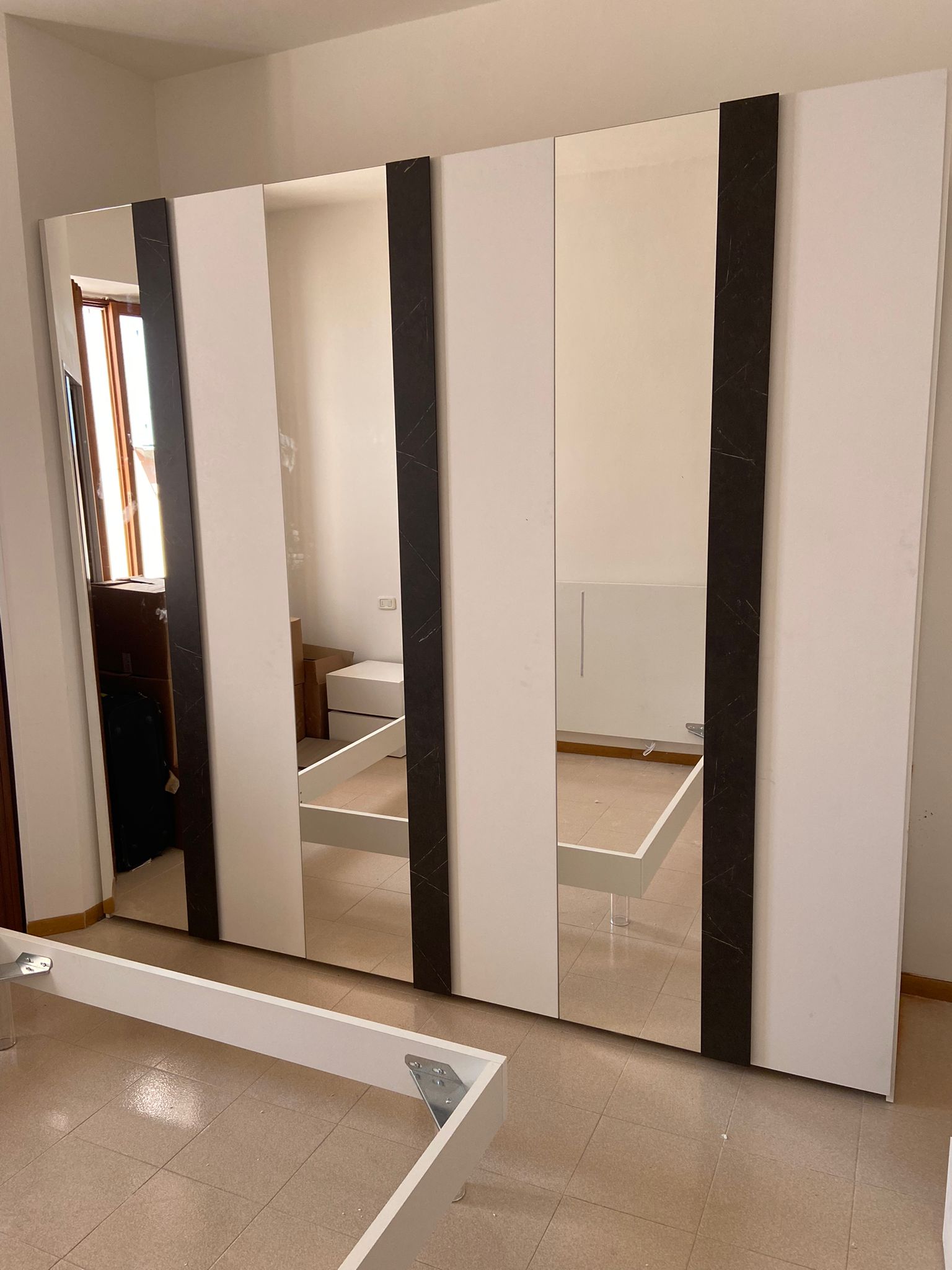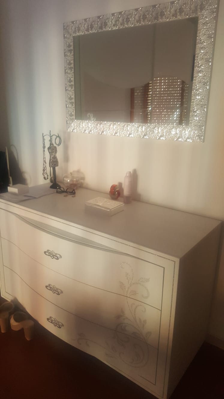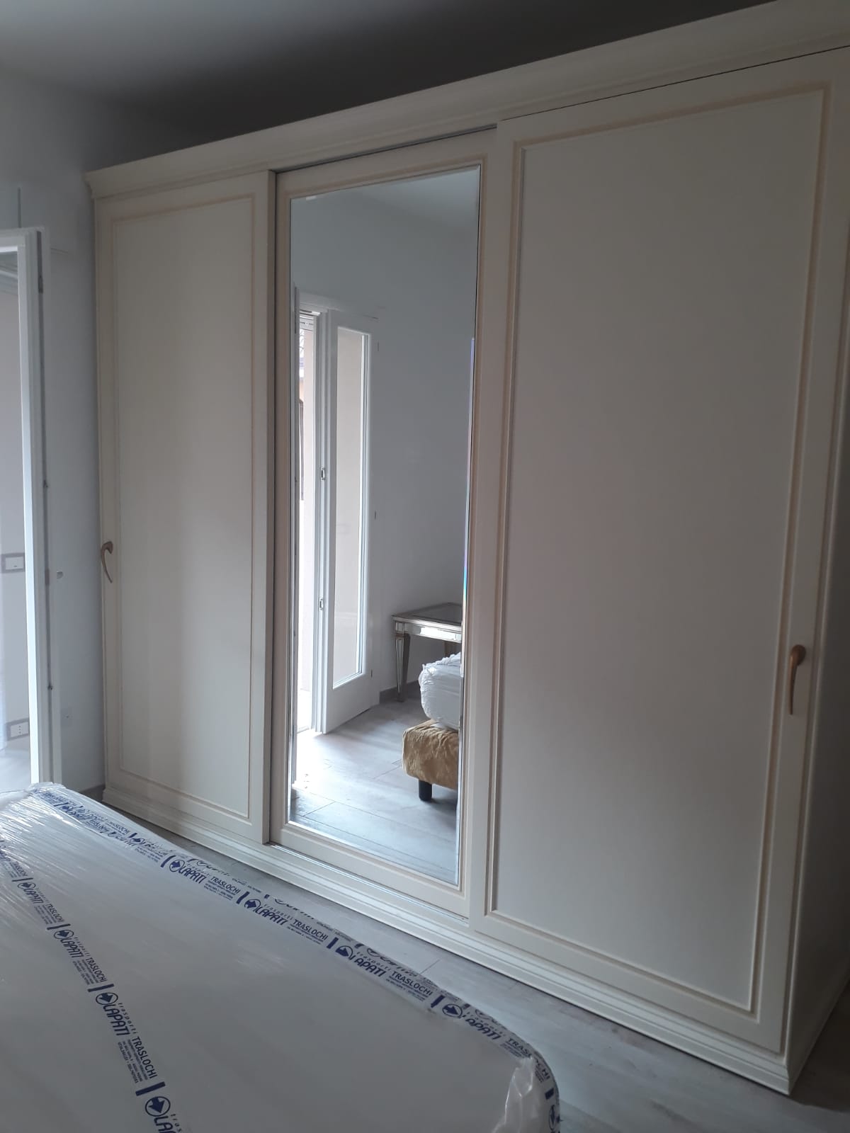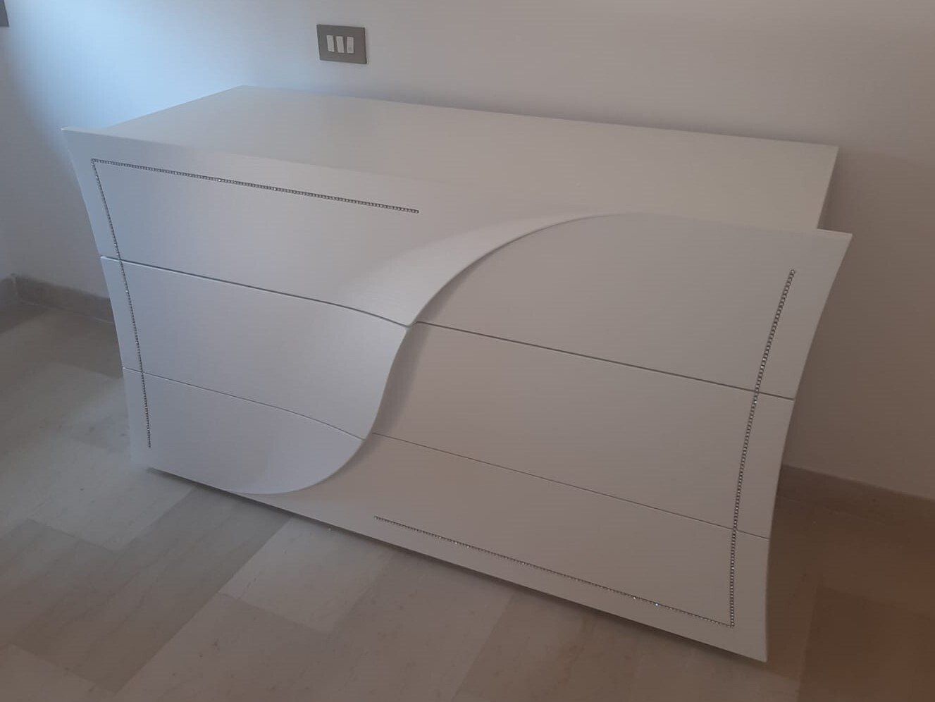 Realizziamo su misura armadi Style in tamburato con 4 ante scorrevoli diamantate, in colore bianco a poro aperto. L’armadio è corredato da 2 comodini e 1 comò in finitura foglia oro.