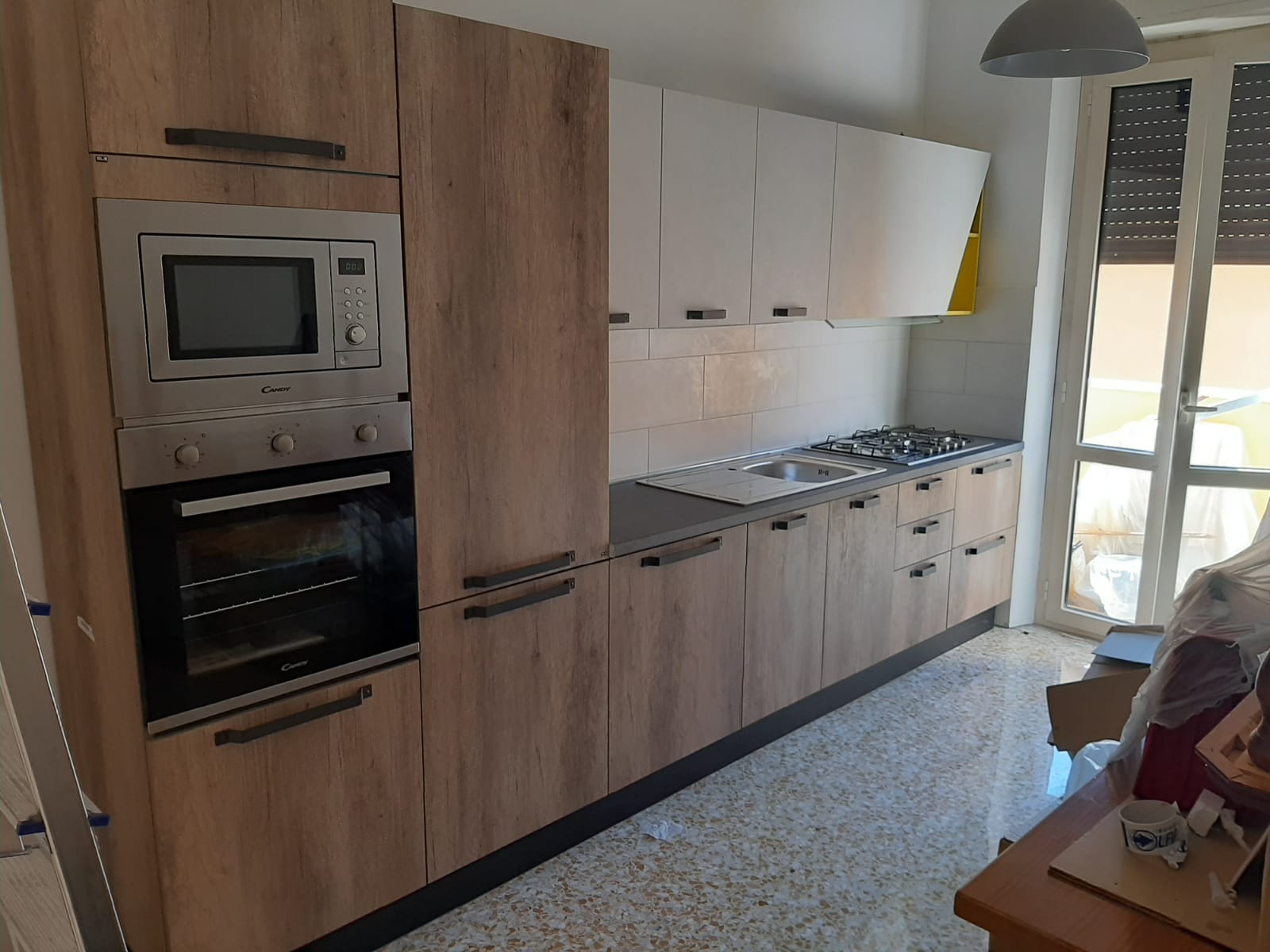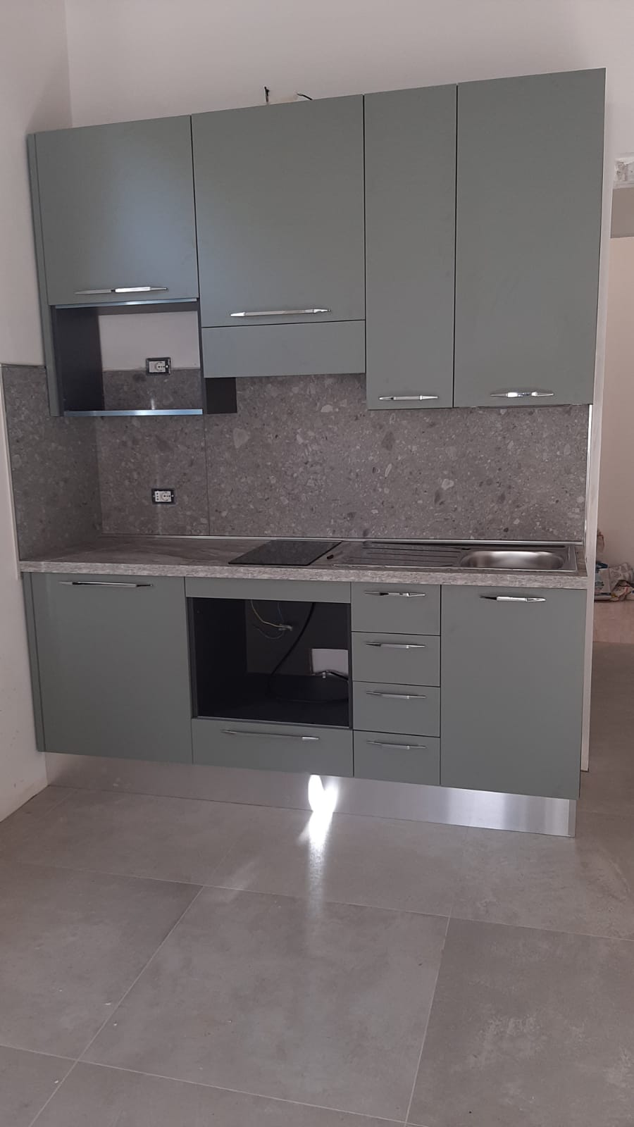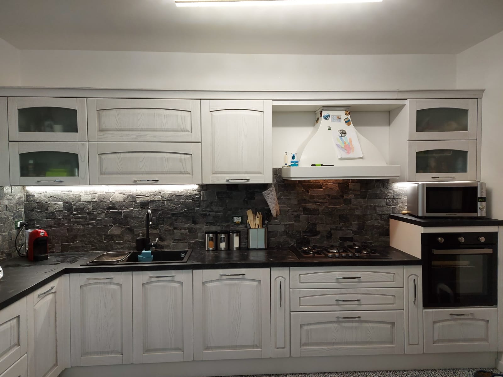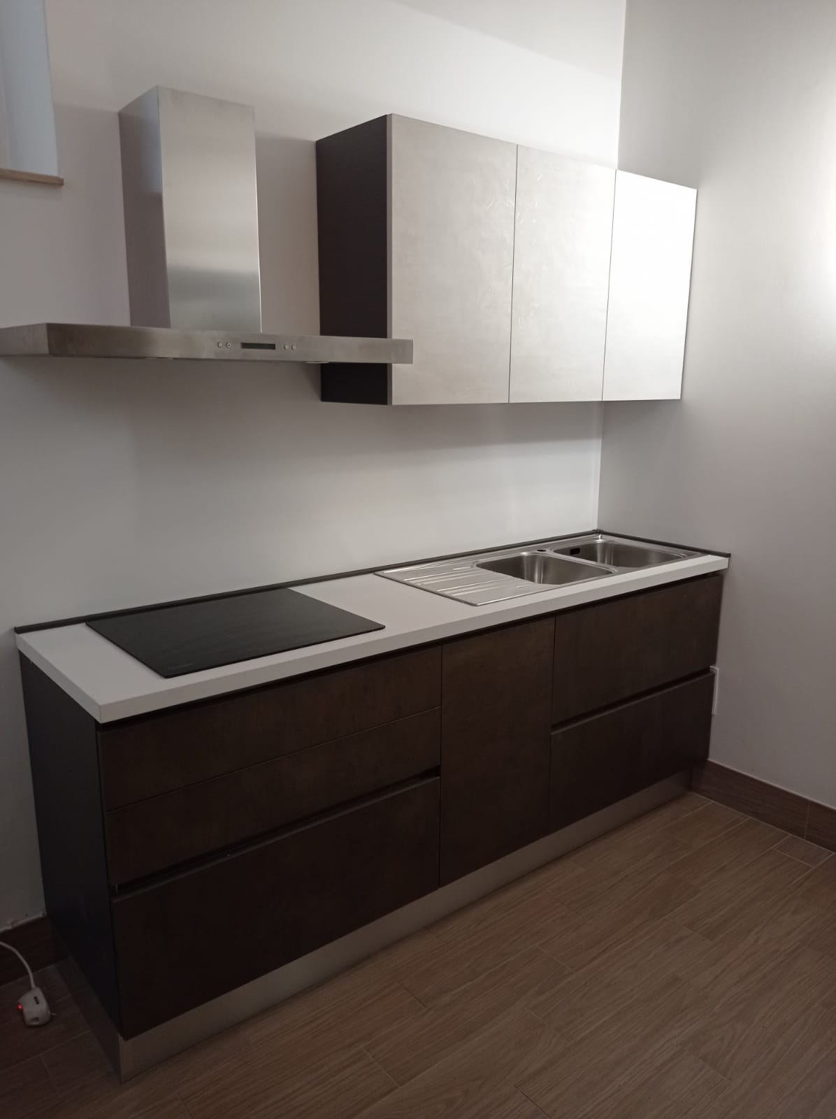 Cucina modello Paprika lineare, completa di elettrodomestici, con ante in melaminico effetto legno sp. 1,8, bordate 4 lati ABS. Colori vari a catalogo.Parete soggiorno modello Living, con ante in melaminico effetto legno sp. 1,8 bordate 4 lati ABS. Colori vari a catalogo.