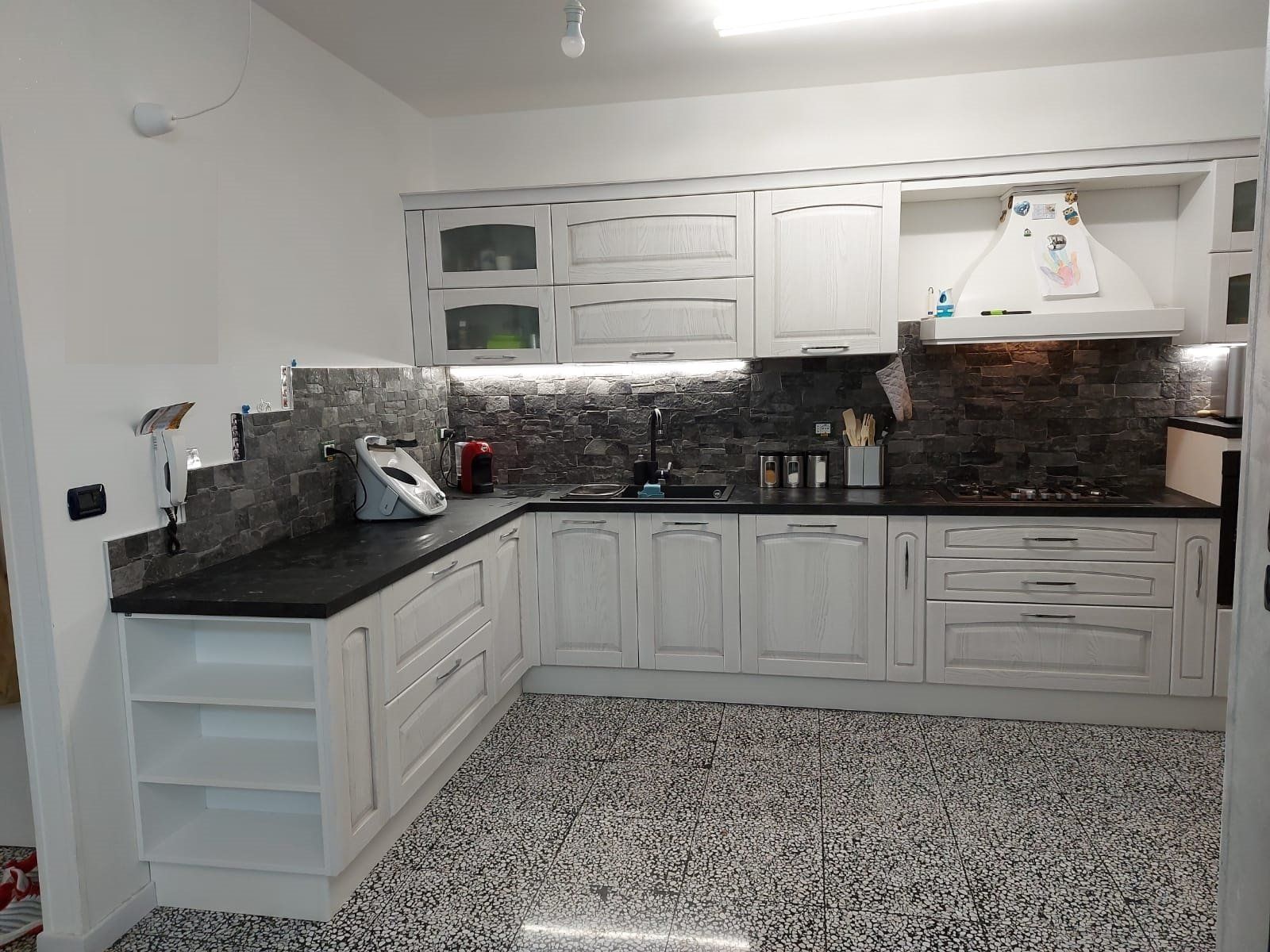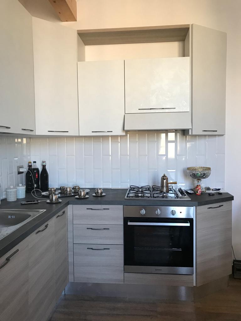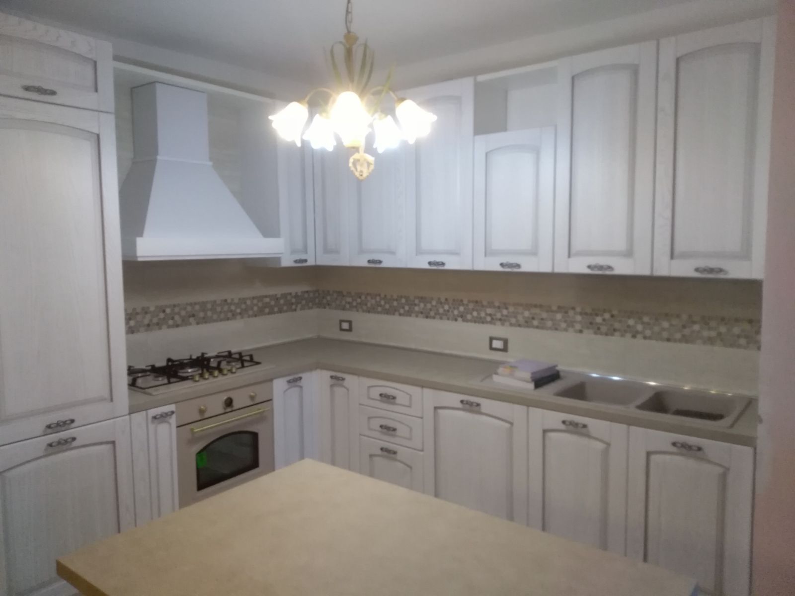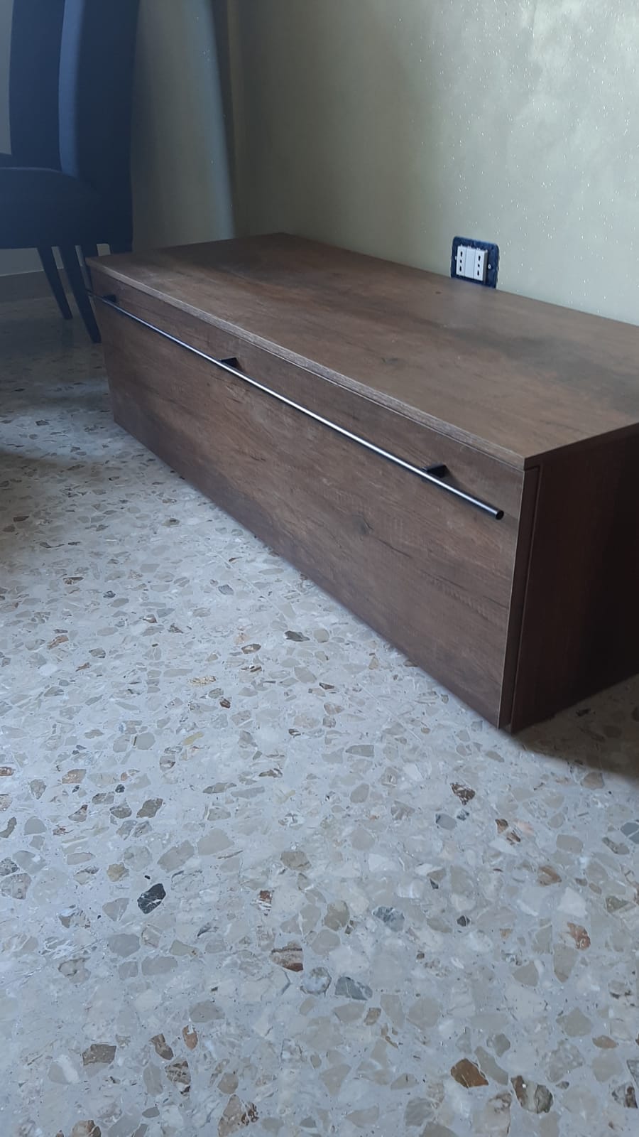 Cucina modello Paprika lineare, completa di elettrodomestici, con ante in melaminico effetto legno sp. 1,8, bordate 4 lati ABS. Colori vari a catalogo.Parete soggiorno modello Living, con ante in melaminico effetto legno sp. 1,8 bordate 4 lati ABS. Colori vari a catalogo.